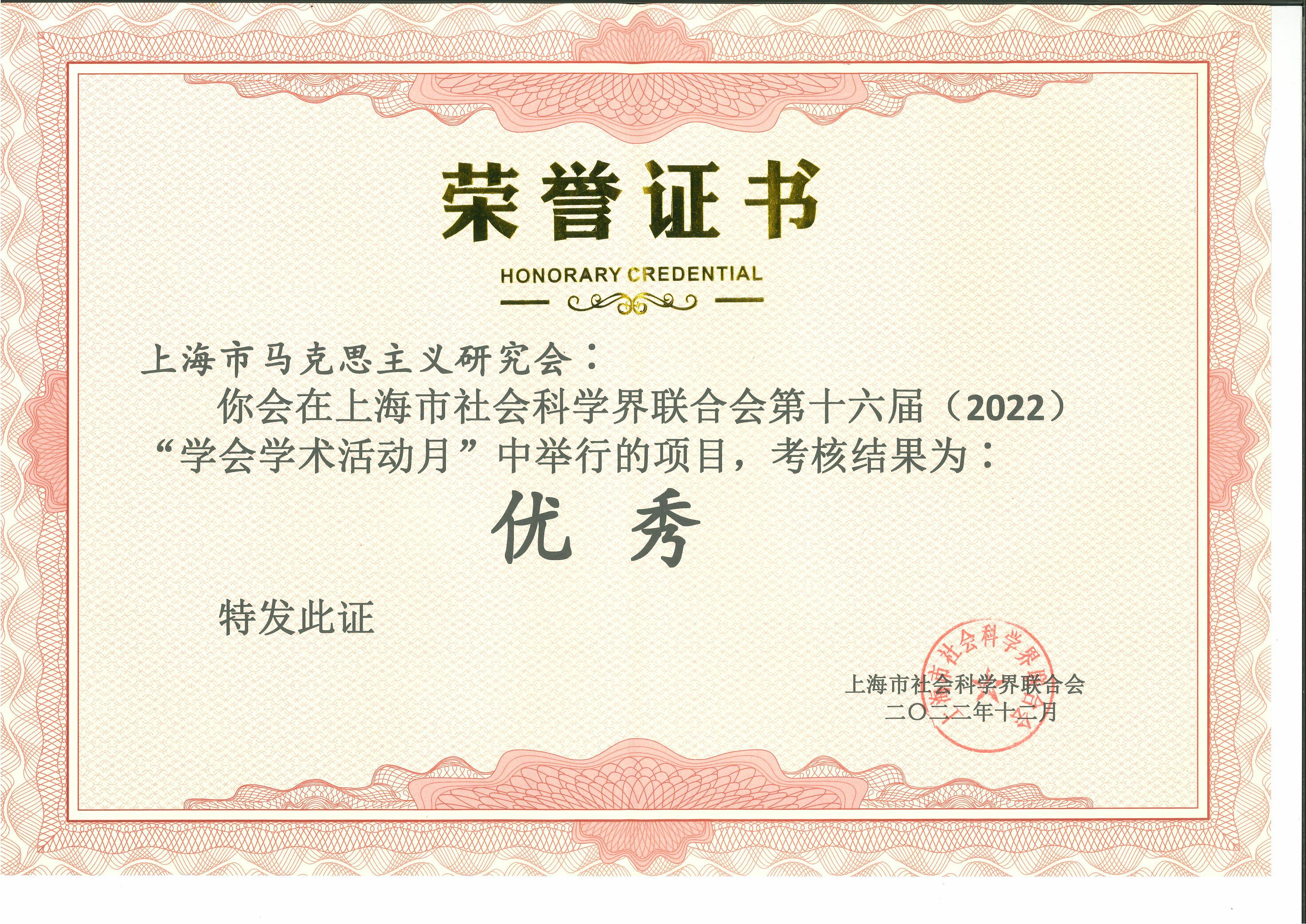 近日,在上海市社会科学界联合会第十六届(2022)“学会学术活动月”项目评比中,挂靠AG百家乐官网的上海市马克思主义研究会获得了考核结果“优秀”的称号,并获得市社联颁发的荣誉证书。此次获奖是上海市马克思主义研究会所取得的又一佳绩。