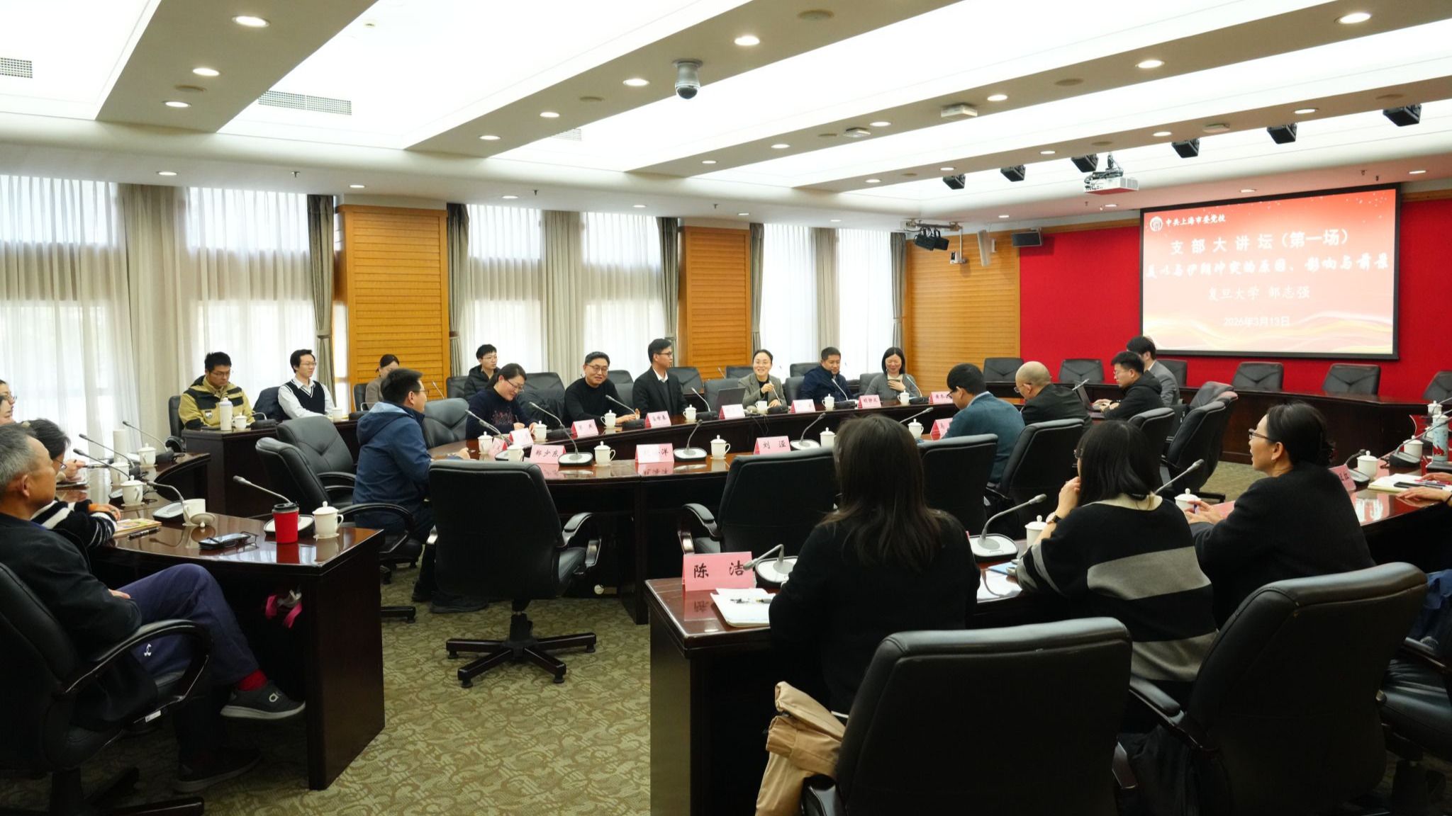 3月13日下午,由外事处党支部承办的2026年第一场支部大讲坛顺利举办。活动特邀复旦大学中东研究中心研究员邹志强以“美以与伊朗冲突的原因、影响与前景”为题,作专题讲座。全校近50名师生参加。