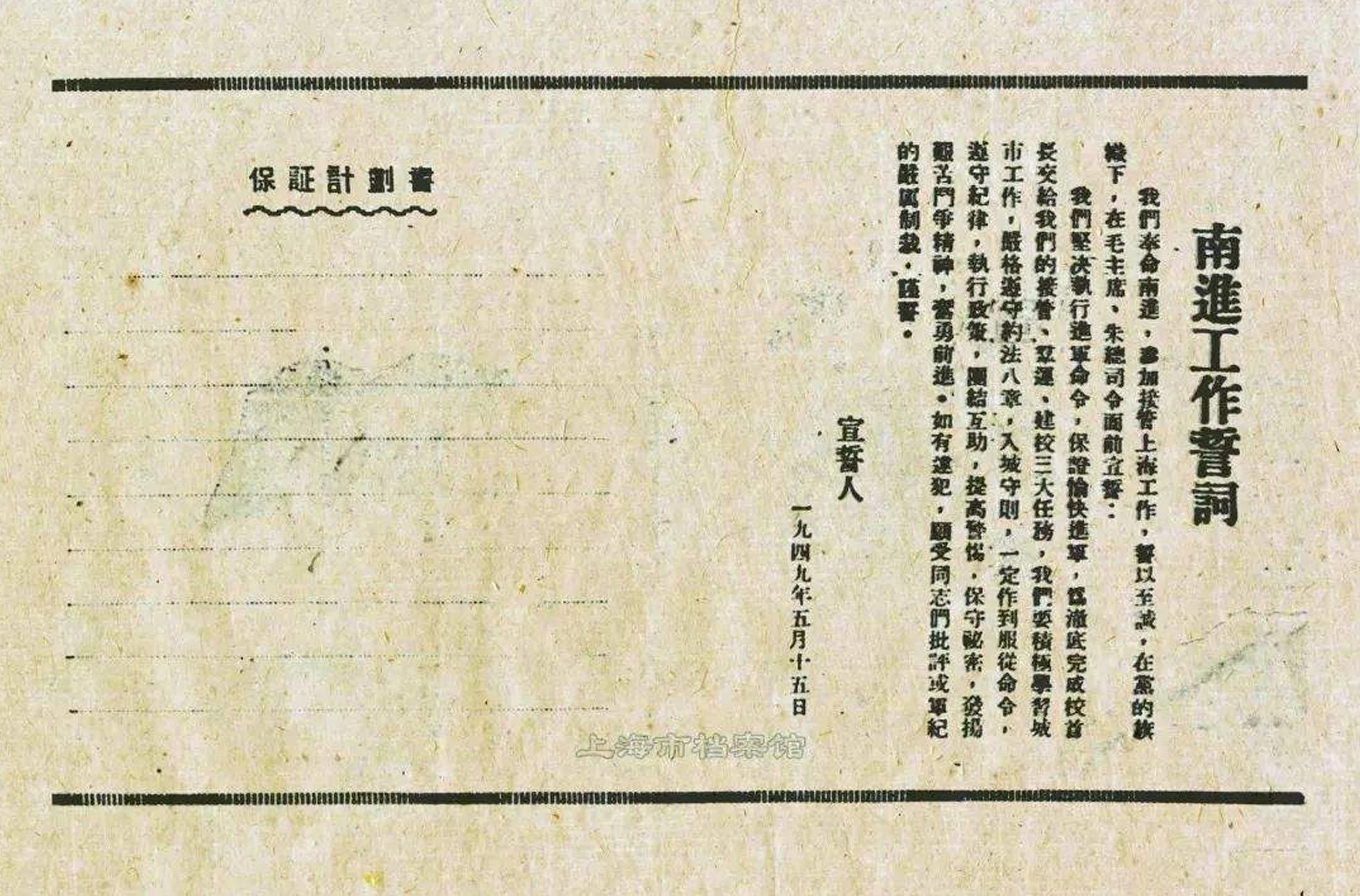 AG百家乐官网在人民解放战争的胜利进军中创建并在社会主义革命和建设进程中积极探索。1949年5月中旬,上海还未解放,中共中央华东局和中共上海市委在江苏丹阳部署解放、接管上海工作时,作出了筹建上海市委党校的决定。南进工作誓词中(图1),将建校作为三大任务之一。