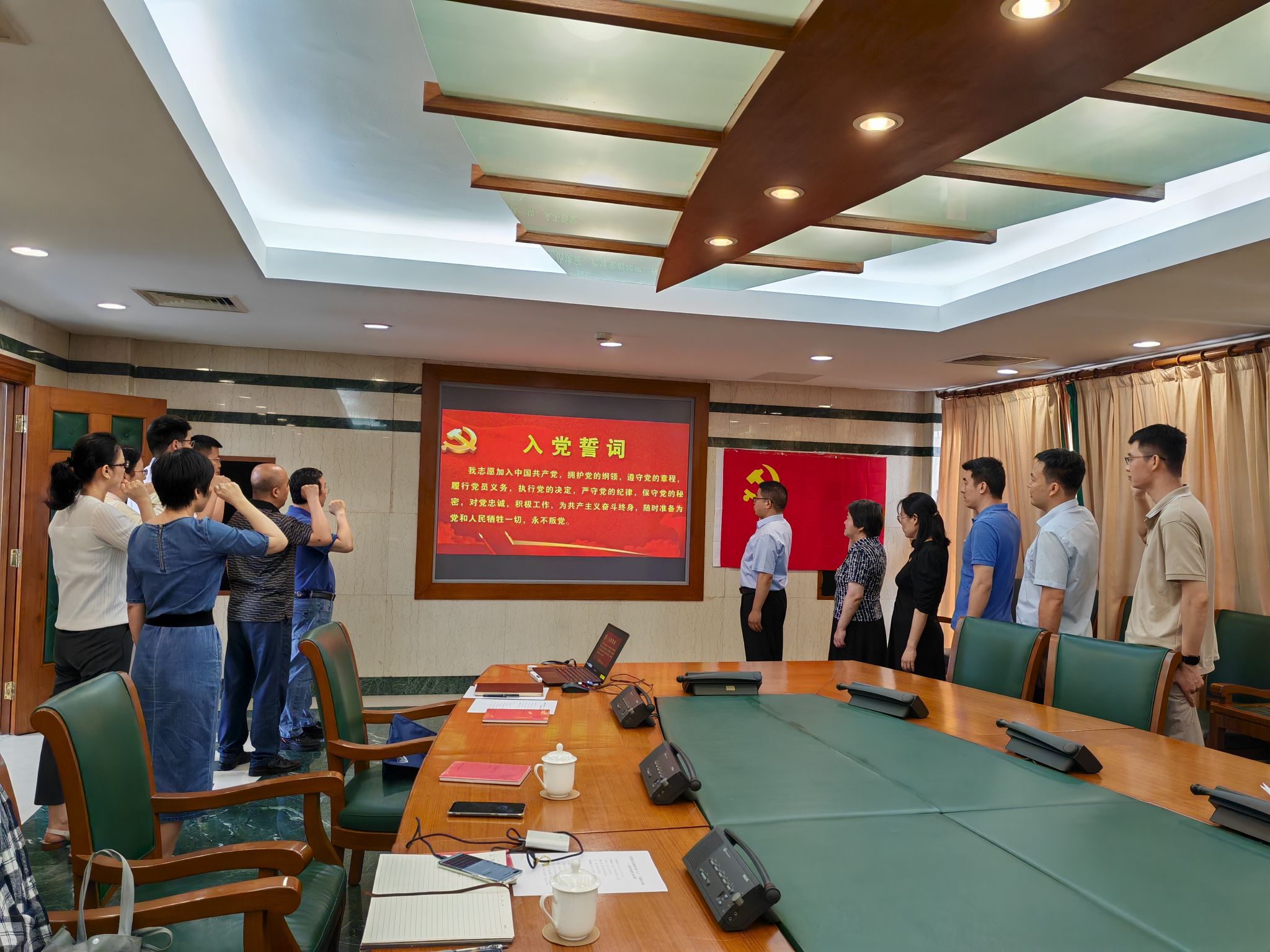 随后,支部书记吴从环带领全体党员,重温入党誓词,铮铮誓言,一字千钧。观看入党学习微视频《十份入党申请书》,学习习近平总书记年轻时坚忍不拔和一心向党的入党初心。为两位同志献上了政治生日贺卡,祝福他们今后取得更大的进步。详细讲解了校内的红色地标,从校大门开始,经过大礼堂、马恩像,再到图书馆、“复兴中华”四栋楼,最后到宣誓广场和初心教室等,从建筑的角度分享了校内的红色文化,让大家更加深刻领会“党校因党而立、因党而兴、因党而强”的发展历程。同读一本《习近平关于全面加强党的纪律建设论述摘编》,支部书记分享了学习感悟并对书中的十个章节逐一讲解,教育引导支部党员用政治纪律带动其他纪律。三位党员围绕“我的入党故事”分享交流,叩问入党初心,回顾入党历程,从思想上和行动上更加坚定了“入党是一辈子的事情”的信念。