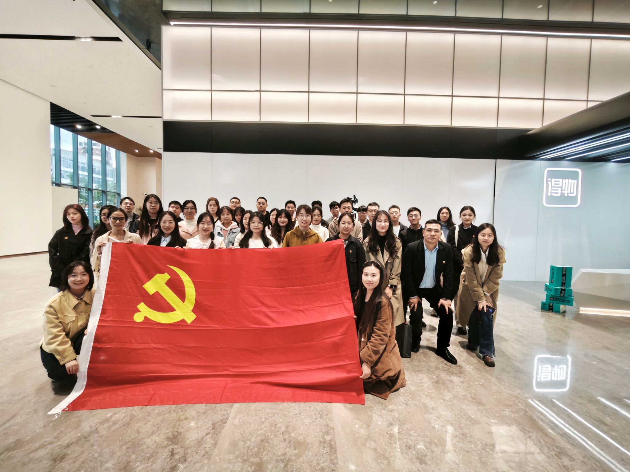 随后,支部党员们前往位于上海市杨浦区黄兴路221号T7栋的得物公司进行参观。“智能化运营模式是得物在当今数字化时代脱颖而出的关键所在。”在得物公司党委副书记包丞益的讲解中,同学们深入了解了得物的发展历程、企业文化,了解其如何借助前沿技术实现高效、精准的运营,为用户打造优质的服务与体验。参观结束后,围绕“互联网民营企业的党建情况”,双方展开了座谈交流,同学们热情高涨,积极就多个备受关注的问题作了深入的提问探讨交流。包丞益从“让党员流动不流失”“党员亮身份、争先作表率”“组建‘青春宣讲团’”的工作成效以及下一步“全覆盖、善引领、强能力、优服务”的工作计划,详细介绍了得物公司在党建工作中的积极探索与实践,分享了诸多党建活动新模式。同学们从互联网企业未来发展趋势,到得物App与用户交互体验定位,再到得物公司党委结构职能以及得物党建宣传方式等,进行了提问和热烈讨论。