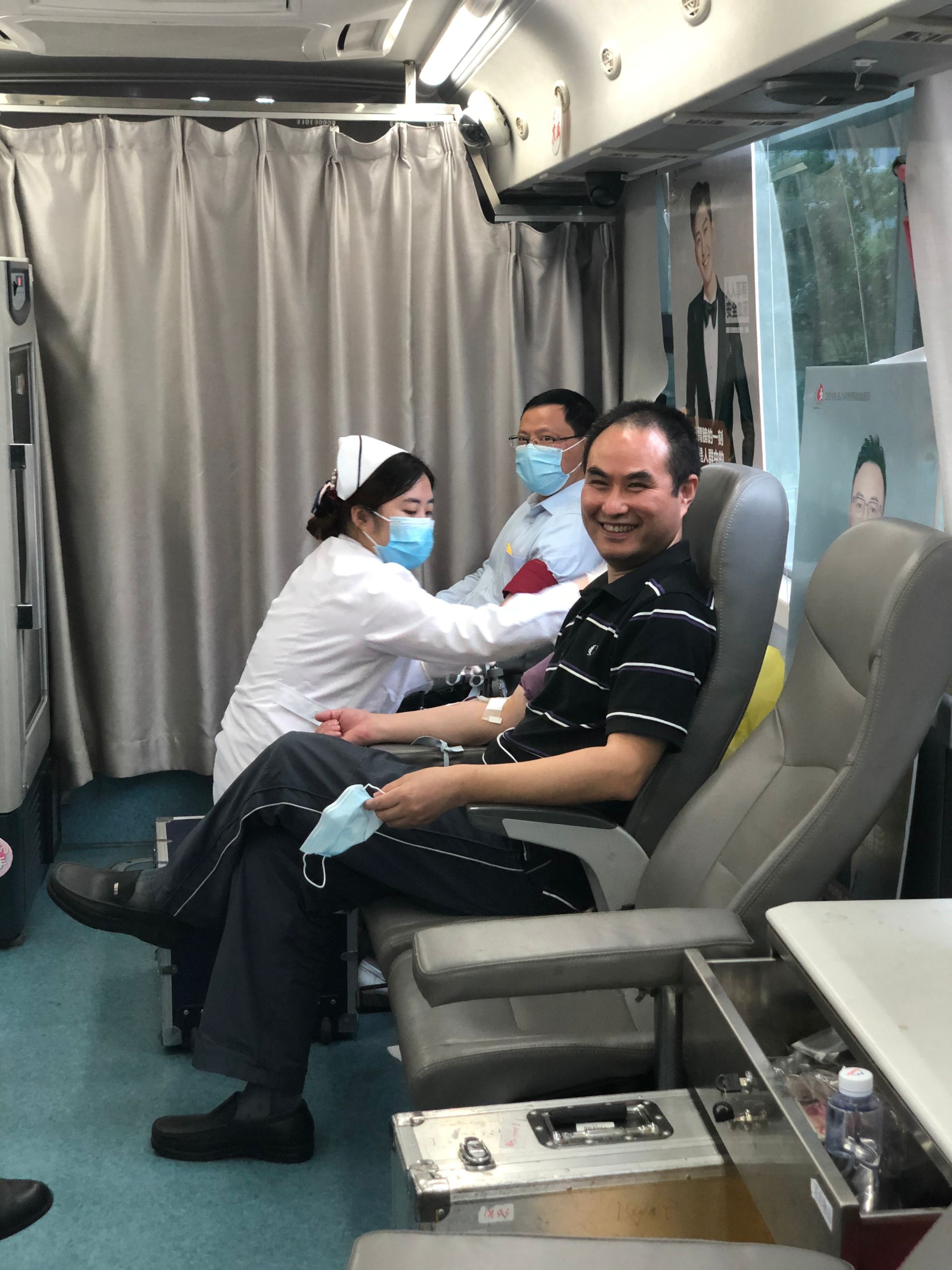 在现场工作人员的引导下,各位老师严格按照疫情防范要求,仔细填写献血登记表,测量血压、抽血化验,待检验合格后登上采血车开始献血。每位老师脸上都洋溢着幸福的笑容,为自己能够奉献一份爱心而骄傲。