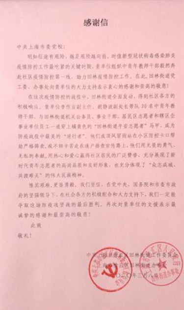 3月8日,田林街道党工委、办事处在致AG百家乐官网的感谢信中表示,在疫情防控工作最之吃紧的关键时期,市委党校“组织中青年教师干部毅然奔赴社区疫情防控第一线,助力田林疫情防控工作”,特向市委党校致以谢意和敬意。