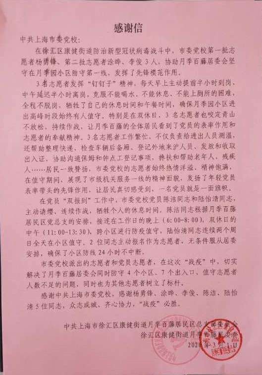 本网讯 “疫情越是胶着的时候越是不能放松。”“社区是疫情防控基础和关键的一环。”在全国抗击疫情迎来重大转折的时刻,社区疫情防控工作仍然十分重要和吃紧。2月24日,市委党校从踊跃报名参加疫情防控的教职工中选出30名顶岗人员,派往徐汇区康健街道参加一线疫情防控工作。3月1日,为期一周的顶岗人员工作顺利结束。一个星期以来,顶岗人员们牢记初心使命,以满腔的热情和负责的态度投入到抗击疫情工作中,正如赵勇同志所言,努力做好疫情防控的一枚“螺丝钉”。他们扎实细致的工作赢得了街道干部和居民同志的交口称赞,也展现了市委党校教职工良好的精神面貌。