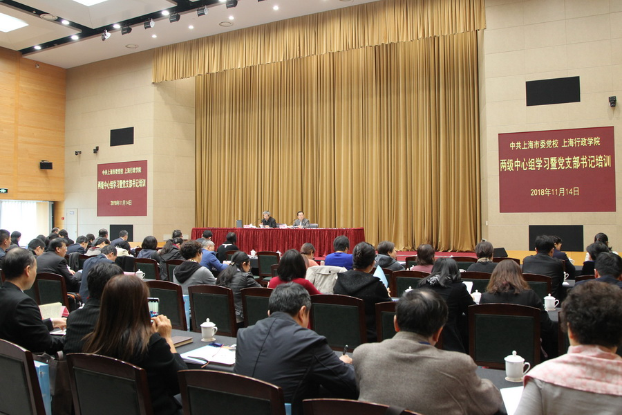 本网讯 11月14日上午,校院在海华101报告厅开展两级中心组学习暨党支部书记培训。中组部党建研究所巡视员、全国党建研究会专职副秘书长陈东平应邀作“习近平总书记党建思想研究”专题辅导报告。报告会由常务副校院长沈炜主持。