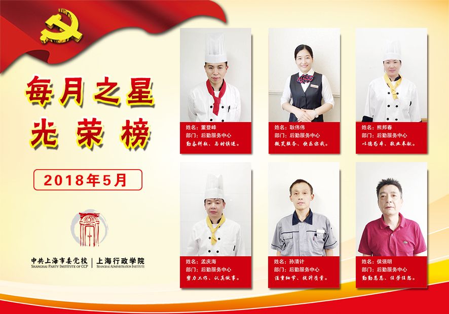 本网讯 为进一步提升校院后勤管理服务工作水平,不断激发服务员工的工作热情,转变工作作风,强化工作职责,增强后勤服务水平及业务技能,提高工作效率,更好地为校院教学、培训、科研等工作和广大学员、教职工提供一流的后勤保障,校院在后勤服务部门一线员工当中开展了“每月之星”和“年度十大服务明星”评选活动。经过服务部门的精心组织,层层推荐,2018年5月,共评选出29名“每月之星”。希望后勤服务人员以他们为榜样,爱岗敬业,勇于奉献,争创一流,为校院事业发展做出新业绩。