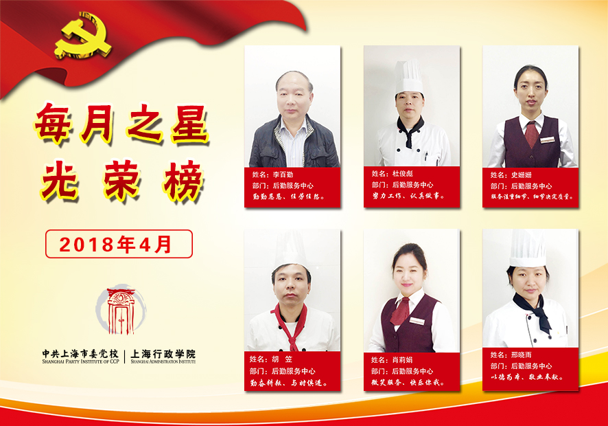 本网讯 为进一步提升校院后勤管理服务工作水平,不断激发服务员工的工作热情,转变工作作风,强化工作职责,增强后勤服务水平及业务技能,提高工作效率,更好地为校院教学、培训、科研等工作和广大学员、教职工提供一流的后勤保障,校院在后勤服务部门一线员工当中开展了“每月之星”和“年度十大服务明星”评选活动。经过服务部门的精心组织,层层推荐,2018年4月,共评选出30名“每月之星”。希望后勤服务人员以他们为榜样,爱岗敬业,勇于奉献,争创一流,为校院事业发展做出新业绩。