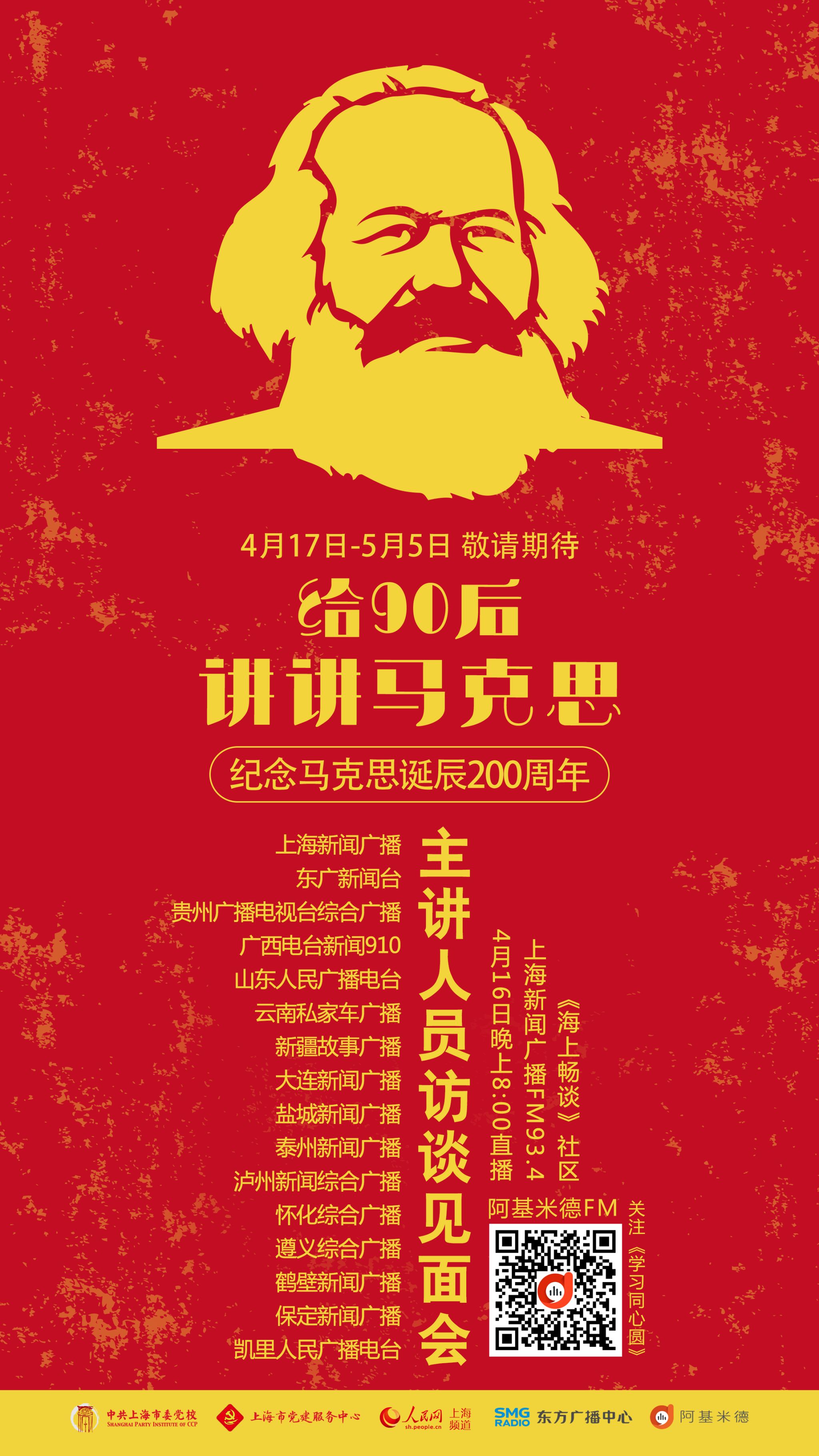 从4月17日开始“给90后讲讲马克思”的短音频将通过《学习同心圆》社区向全国听众网络播出。与此同时,上海新闻广播FM93.4每天13:00、21:10,东广新闻台FM90.9每天11:00、13:00也将连续播出19天。