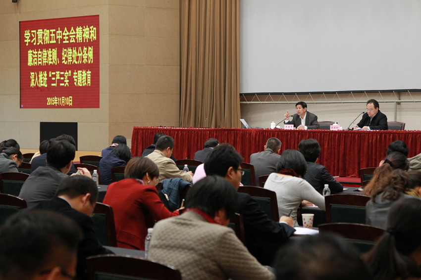 本网讯 11月10日下午,上海市委党校在海华大厦101报告厅开展学习贯彻五中全会精神和廉洁自律准则、纪律处分条例,深入推进“三严三实”专题教育党员学习会。常务副校长王国平传达十八届五中全会精神,并对全校学习贯彻好全会精神作出部署。副校长郭庆松主持。