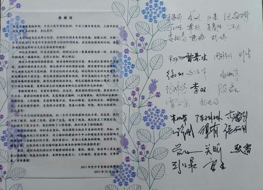 本网讯 为期一个半月的2015年上海市党外中青年干部培训班圆满结业。在结业离校之际,全体学员向我校等培训主办单位发来感谢信,表达学员们最诚挚的谢意。