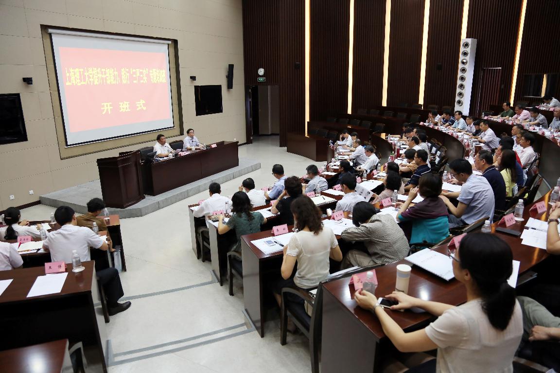本网讯 8月25—27日,上海理工大学提升干部能力、践行“三严三实”专题培训班在我校举办。上海理工全体校领导、中层正职以及版专副校级及以上干部共计80余名学员参加培训。校长胡寿根主持开班仪式,校党委书记吴松作动员讲话。市委党校教育长梅丽红与其会面。