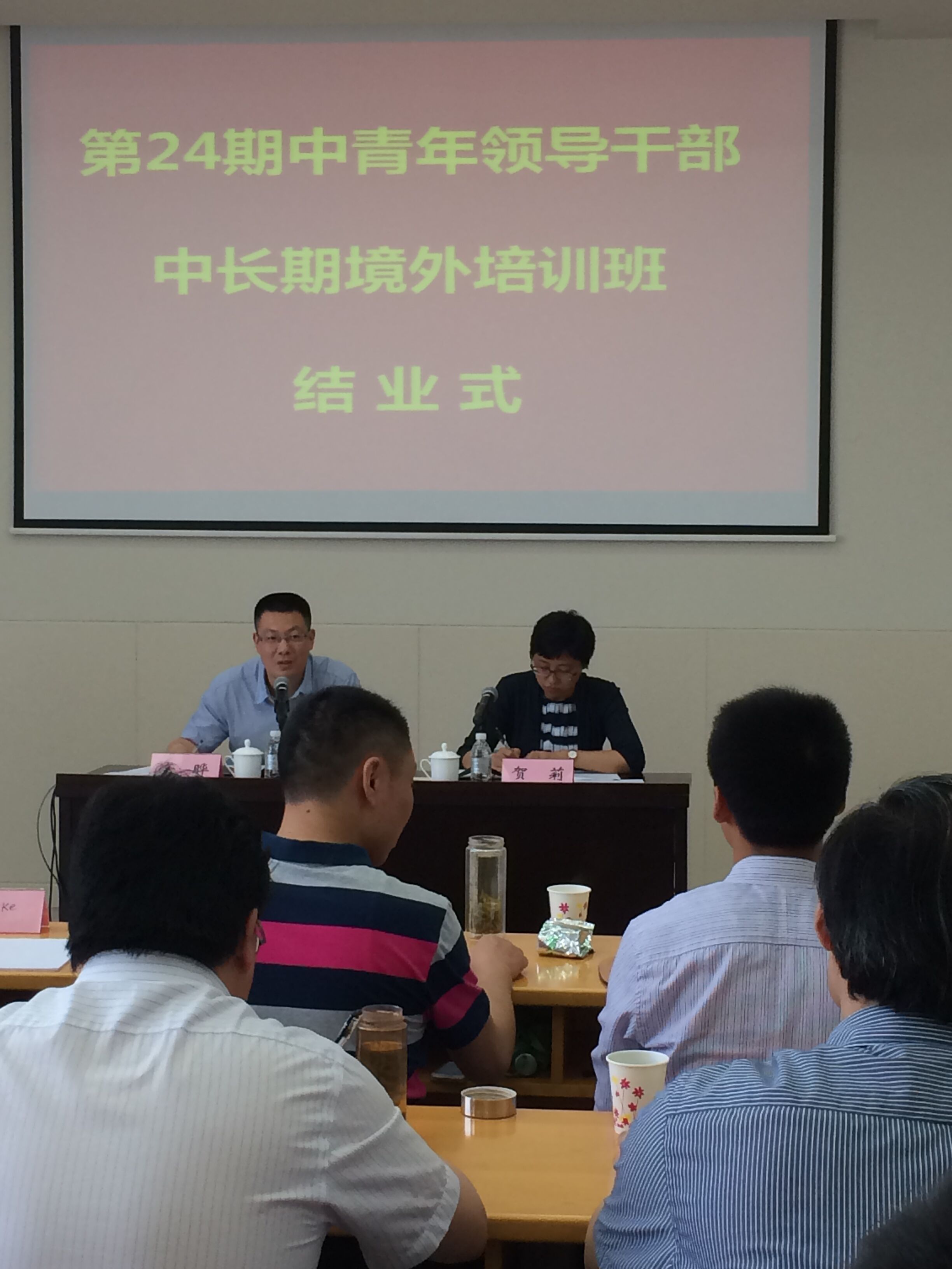 本网讯 6月30日,由市委组织部和市委党校联合举办的第24期中青年领导干部中长期境外培训班(国内培训阶段)结业。市委组织部干教处处长贺莉出席结业式并讲话。
