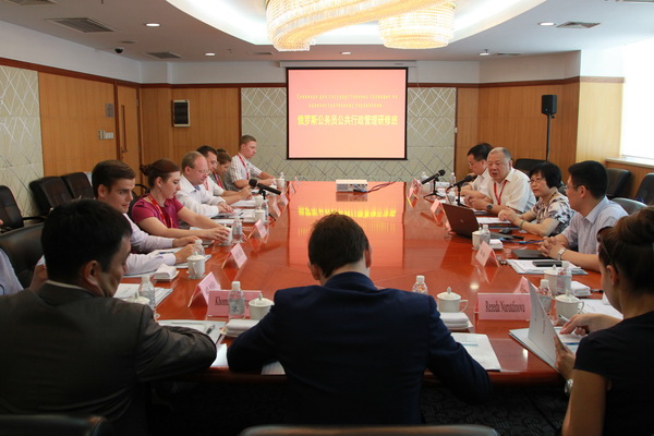 本网讯 为进一步增进中俄友谊、扩大共识、加强互信、拓展合作,受国家行政学院培训中心委托,6月25日,俄罗斯公务员公共行政管理研修班来我院研修。本研修班旨在帮助俄罗斯学员更多地了解中国公共管理改革经验及发展方向。研修班由来自俄罗斯中央和地方政府部门及莫斯科大学的12名司处级官员组成。国家行政学院培训中心原主任邵文海先生随班访问我院。