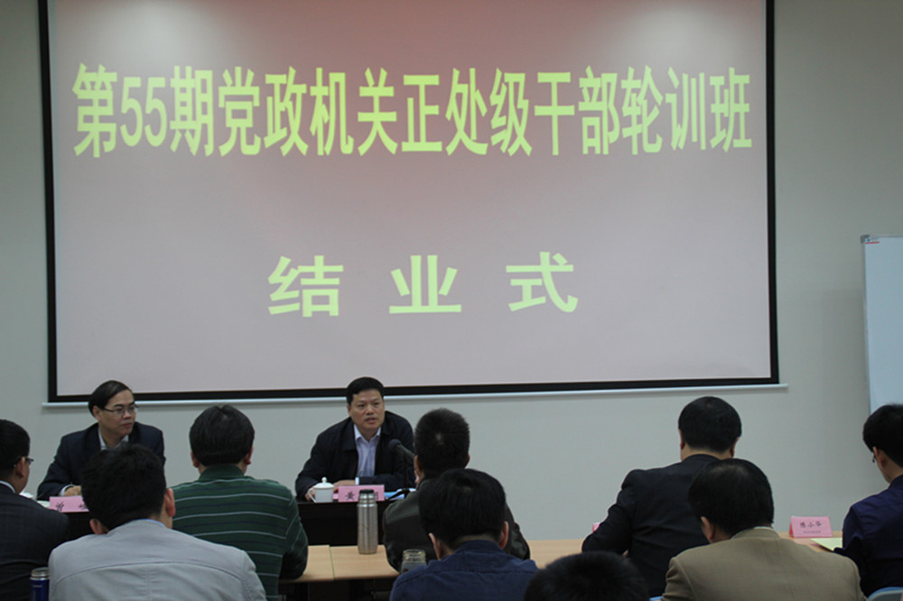 本网讯 4月3日上午,我校第55期党政机关正处级干部轮训班结业式在海华302教室举行。副校长曾峻出席结业式并讲话,市委组织部干教处调研员、副处长黄达明主持。