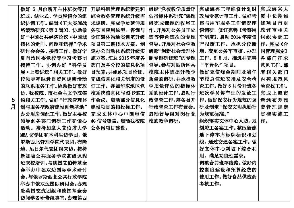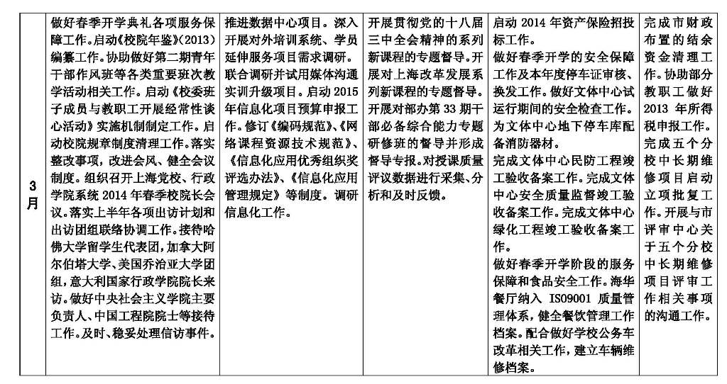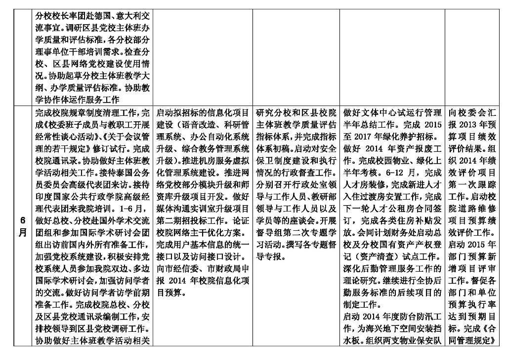 会议强调,当前要研究并树立“全要素教育”理念,确保管理服务在高位运行条件下实现可持续升级。为此,要重点研究解决四个方面的问题:一是提升信息化应用水平。特别要根据校院的情况,提高集成水平,一定要在2015年达到可喜的成绩。分校的信息化建设也要有顶层设计。二是巩固提升文体中心试运行所取得的阶段性成果。要进一步充分听取各方面特别是学员的意见和建议,研究解决遇到的各种问题,到试运行满一年时形成定型的制度机制。三是做好市级资产清查核实和产权登记工作。四是加强预算执行和内部控制。要研究如何在“1+5”体系下提升内控水平,确保工作链条的各个环节都不出问题。要坚持两手抓,一手抓完整的制度建设,一手抓提升从领导干部到业务末端人员的整体素质。对于领导班子来说,从市委党校常务副校长到各分校校长,任何项目都不能打招呼。在这个问题上,要牢记三点:一要守住底线,经得住人情、关系的考验。二要主动监管。三要敢于担当。发现苗头性的问题,要敢于负责处理,防患于未然。要把内部控制建设与党风廉政建设紧密结合,严格要求,从严管理,树立好形象。