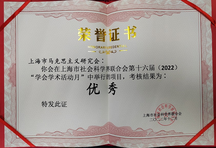本网讯 近日,在上海市社会科学界联合会第十六届(2022)“学会学术活动月”项目评比中,挂靠AG百家乐官网的上海市马克思主义研究会获得了考核结果“优秀”的称号,并获得市社联颁发的荣誉证书。此次获奖是上海市马克思主义研究会所取得的又一佳绩。
