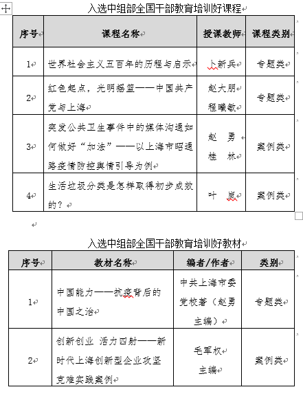 本网讯 近日,中组部印发全国干部教育培训好教材好课程推荐目录,由我校组织遴选申报,经上海市委组织部推荐报送的2门专题课、2门案例课全部入选好课程,另有2本教材入选好教材(具体名单见下表)。