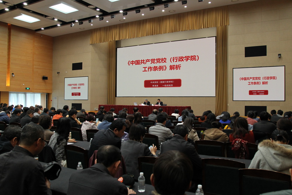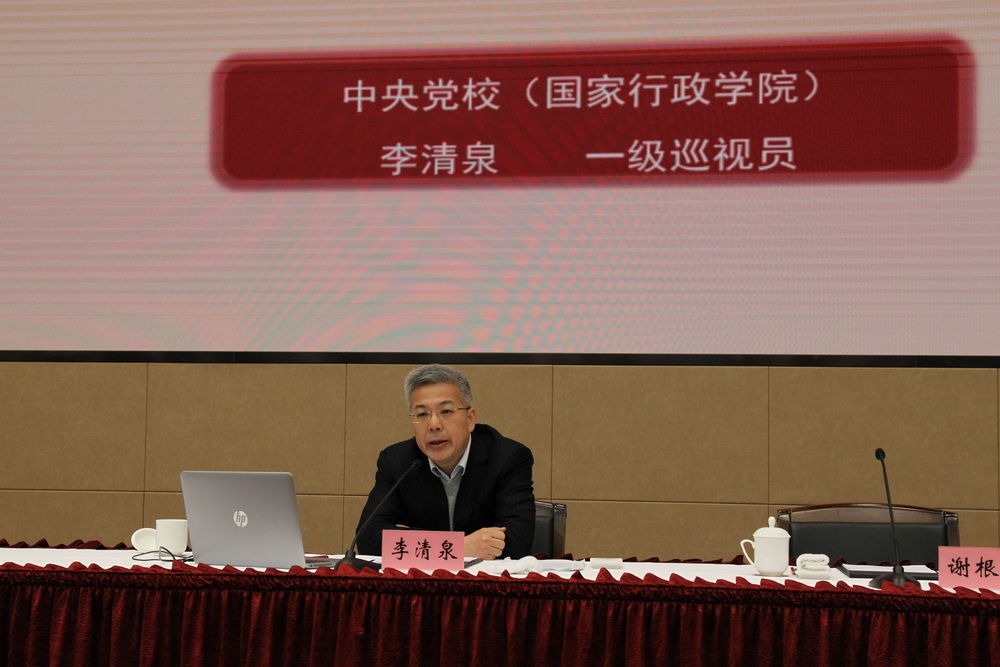 本网讯 11月28日上午,中央党校(国家行政学院)研究室一级巡视员李清泉应邀来校作《中国共产党党校(行政学院)工作条例》(以下简称《条例》)解读,市委党校(行政学院)副校院长谢根华主持报告会。