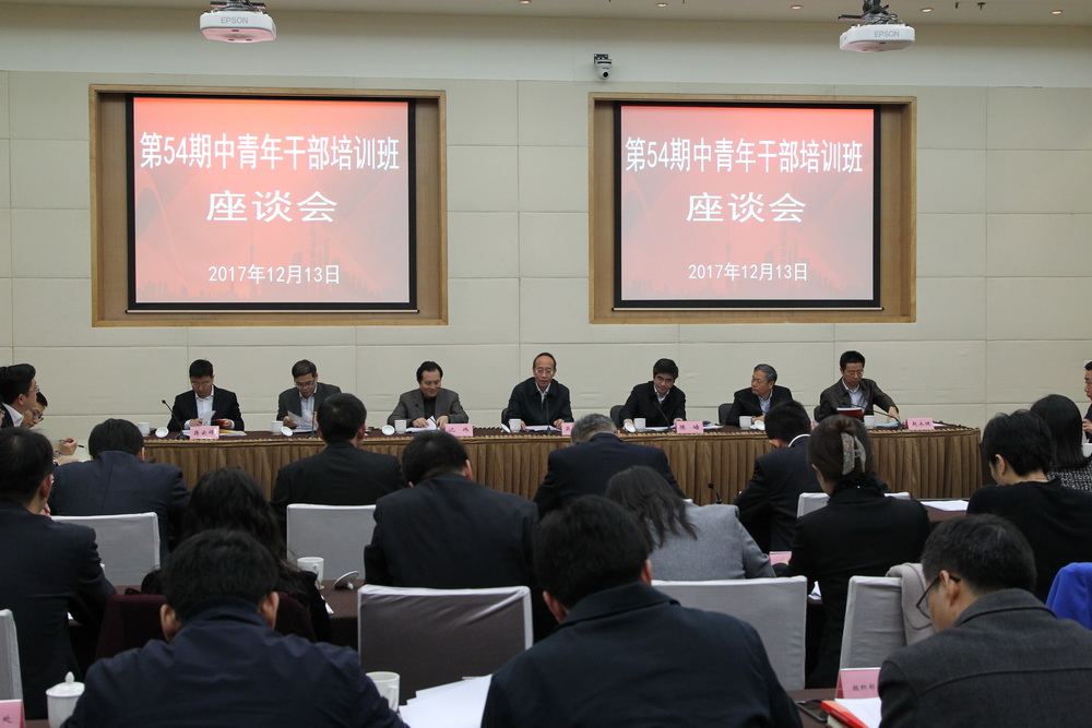 市委组织部部务委员赵永健、蒋云锋,市委党校副校长曾峻,中青班局级组织员徐善良出席座谈会。市委组织部、市委党校相关部门负责人,第54期中青班全体学员参加座谈会。(照片由朱锋提供)