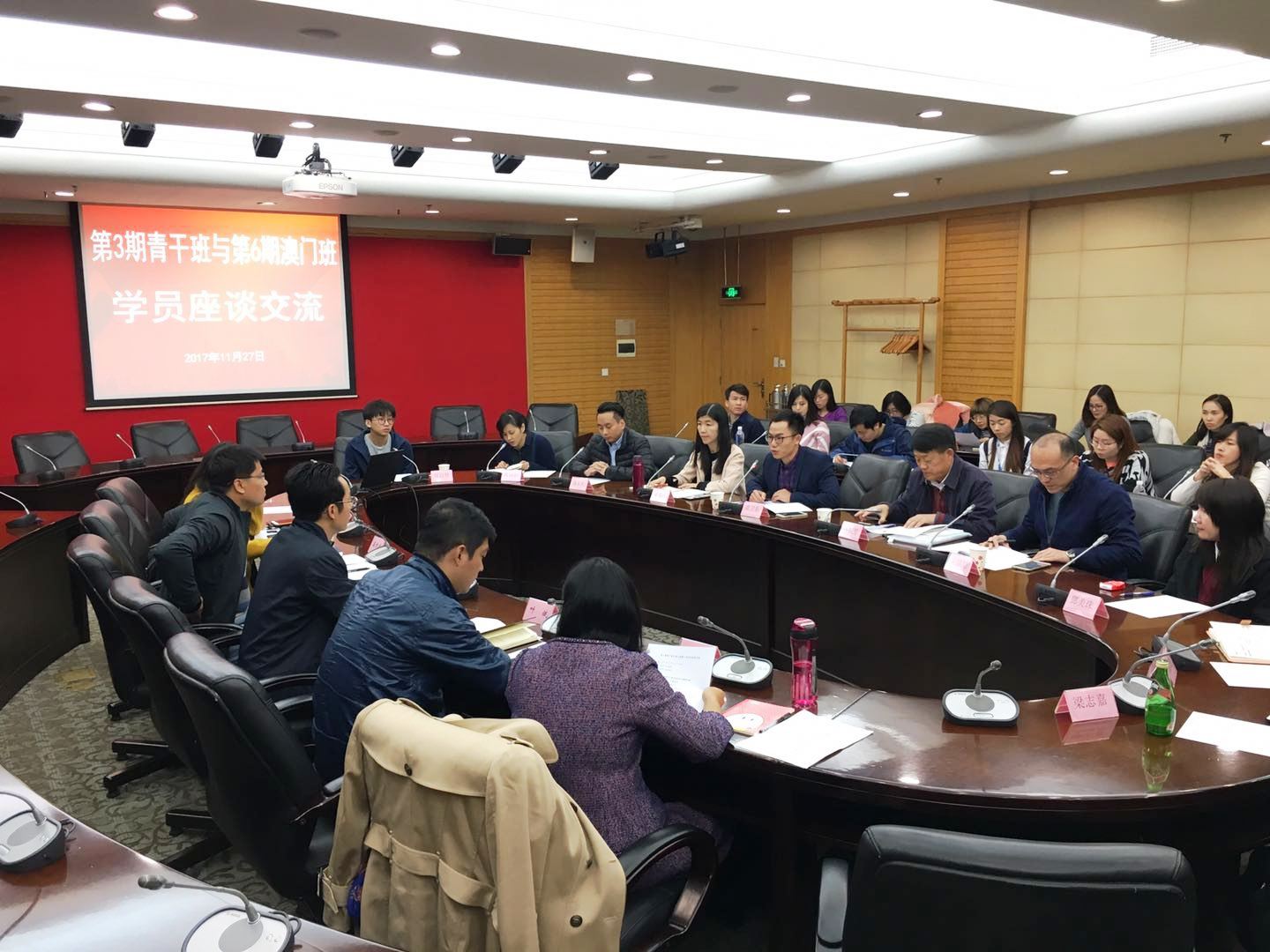 本网讯 11月27日晚,第3期青年干部党性教育专题培训班与第6期澳门特别行政区青年人才上海学习实践班跨班交流座谈举行。活动围绕“青年人如何成才”的主题,以青年的身份,从青年的视角,结合自身成长经历与体会进行了交流。第3期青干班学员代表、第6期澳门班全体学员及两班的班部老师参与活动。