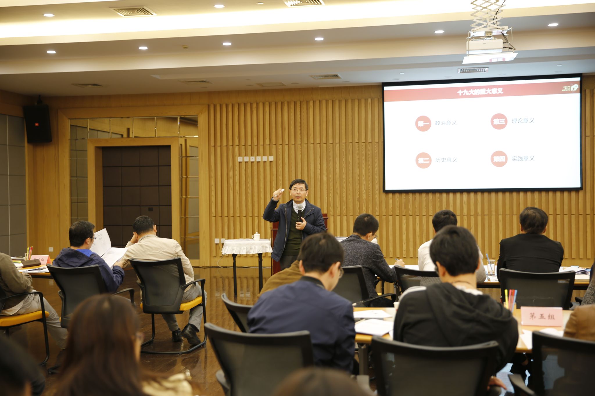 教务处处长王公龙教授以“问题牵引法”带领党员们深入学习贯彻党的十九大精神。王教授以“如何理解五年来党和国家发生的历史性变革”“如何理解中国特色社会主义进入新时代”“如何理解新时代我国社会主要矛盾的转化”等几个重要问题为纲,围绕“新宣言:迈向民族复兴的光辉文献”主题,以阅读报告文本为基础,以理论与实践的结合为抓手,通过“问题牵引式”教学法讲解、互动,深入学习、认真研讨,进一步充分领会大会报告特别是习近平中国特色社会主义思想的核心要义和思想精髓。