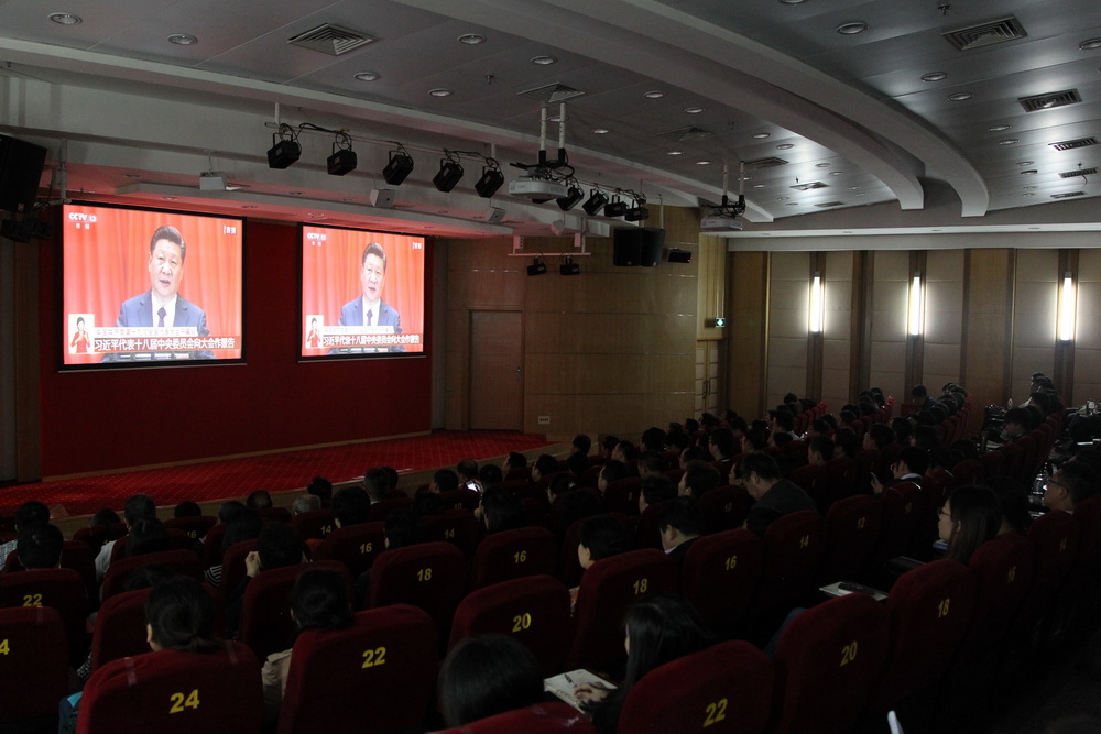 佩戴着党徽的教职工和学员早早来到会场,等待收看十九大开幕会。大会开始之后,教职工和学员跟随会议进程进行了唱国歌和为革命先辈默哀活动。当习近平总书记作报告时,教职工与学员屏息静气,认真聆听,不时在笔记本上迅速记录,为报告内容击掌赞叹,自豪与振奋之情溢于言表。收看结束后,大家表示,“报告总结了过去5年的成就,更指明了未来一段时间中国的发展方向,催人奋进”“报告内容丰富、信息量大,要深入学习”。大家还在微信群中及时转发主流媒体对大会的一线报道和现场报道,交流观看心得。