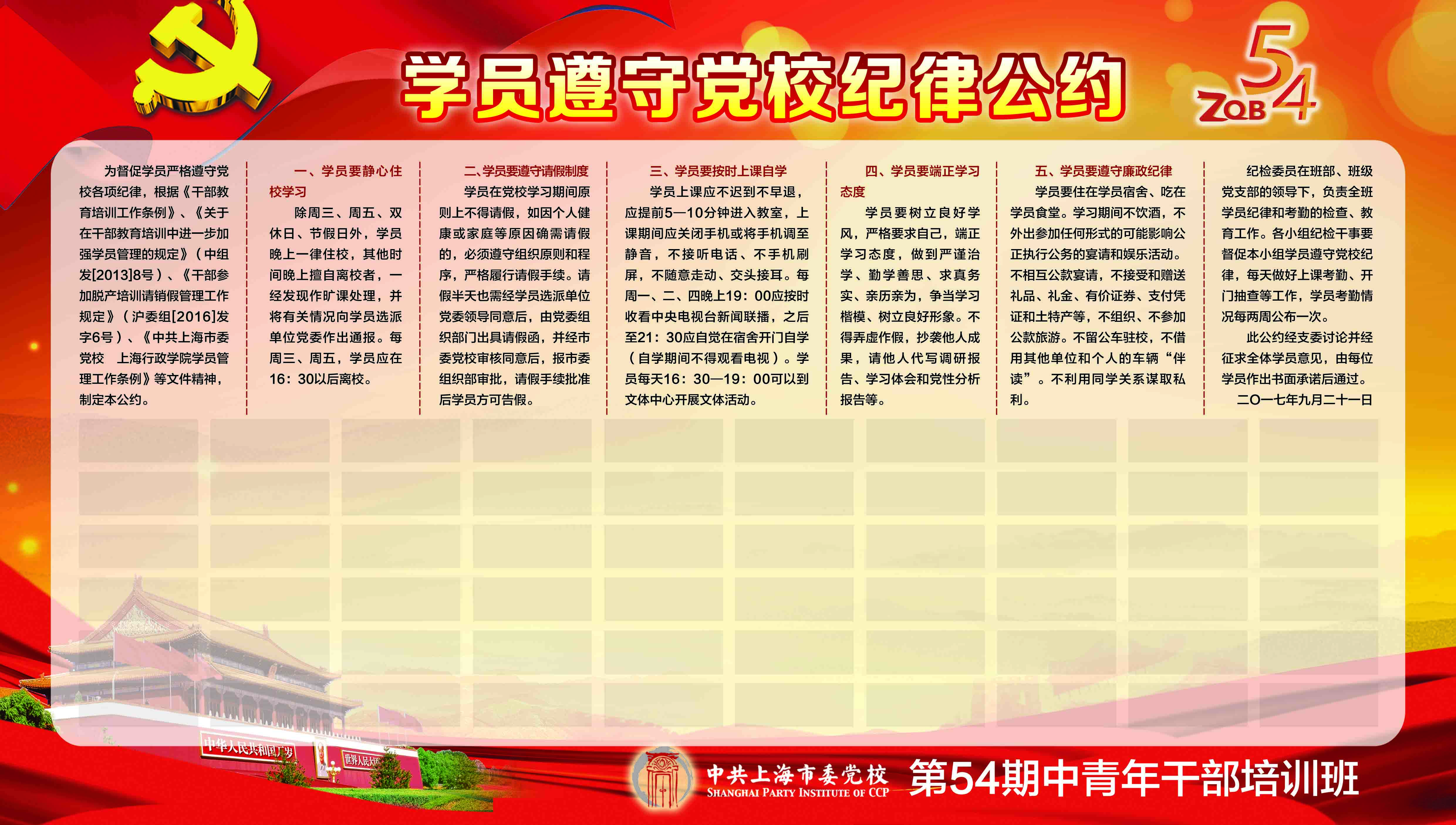 “公约”还明确要求纪检委员、各小组纪检干事切实担负起监督职能,坚持他律、自律“两手抓、两手硬”,以期将54期中青班打造成遵守党校纪律的典范,为全面、高质完成培训任务打下坚实的纪律基础。
