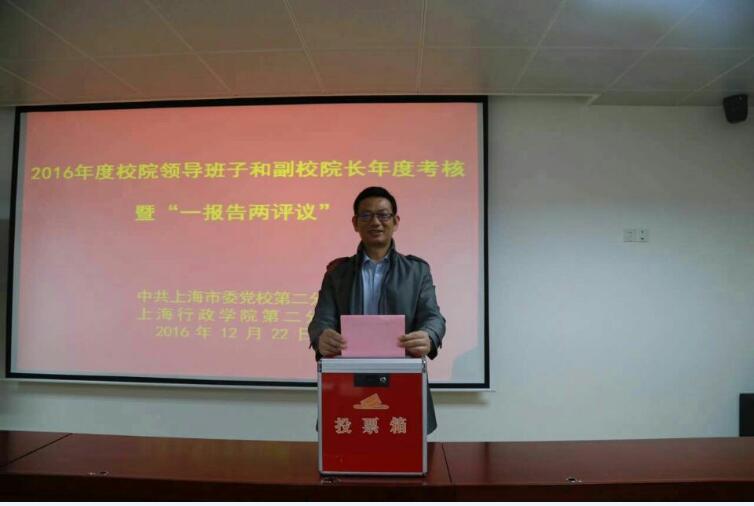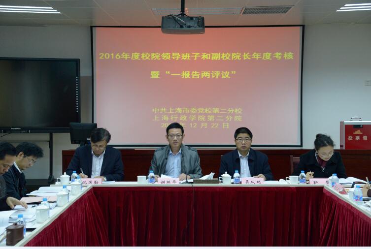 本网讯 12月22日上午,市委党校第二分校在校综合楼第一教室召开2016年度校院领导班子和副校院长年度考核暨“一报告两评议”会议,会议由第二分校院长谢根华主持,校院领导班子及全校在编人员参加了会议,市委党校组织人事处相关同志全程参与。