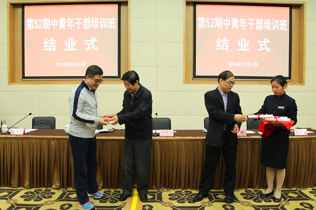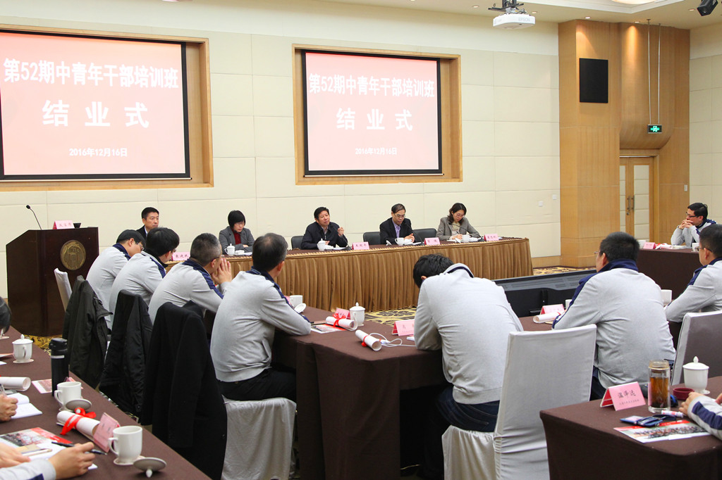本网讯 12月16日上午,第52期中青年干部培训班结业,常务副校长王国平出席结业式并讲话,副校长曾峻主持结业式,教育长梅丽红、市委组织部干教处处长窦忠秋、第52期中青班局级组织员袁建民出席结业式。