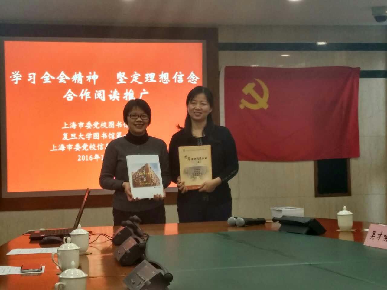 本网讯 12月16日下午,校院图书馆、信息化管理处和复旦大学图书馆第一支部等三个党支部在校院图书馆开展主题为“学习全会精神、坚定理想信念、合作阅读推广”的联合创意组织生活。组织生活内容丰富,既强调严肃认真、又强调生动活泼,既讲政治,又重业务,共分四大块,即“党员宣誓仪式、支部书记带头讲党课、交换推荐书单、参观图书馆与文体交流”。校院机关纪委书记钱刚同志出席并作总结点评。