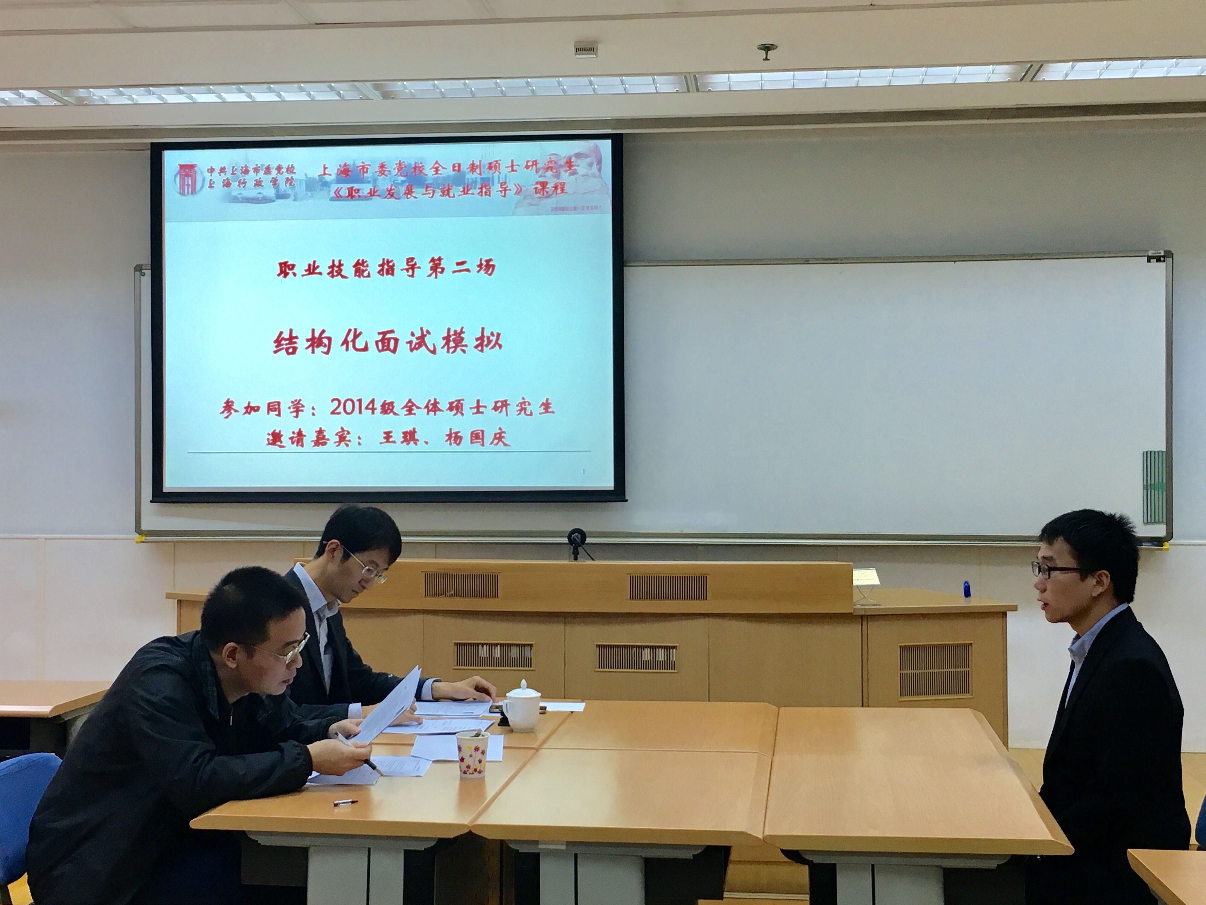 本次结构化模拟面试邀请了王琪和杨国庆两位资深老师担任主考官,同时采用开放式面试的形式,增设了观众席,为其他学生提供现场观摩和学习的机会。本次模拟面试严格按照公务员、事业单位要求的结构化面试的形式进行,全真的面试现场帮助参与者很快进入到面试的状态。四名被面试者按照考官要求,回答四个给定的题目,有1—2分钟的思考时间,并在20分钟内作答。四名同学按顺序分别进行面试。考题有类似于“你认为自己的兴趣和优势适合什么岗位”的针对性题目,也有像“如何处理和同事之间关系”这样比较现实的题目。通过这类题目以此来考察被面试者对本岗位的匹配度、组织能力、语言表达能力、人际关系能力、创新能力、应变能力等素质。