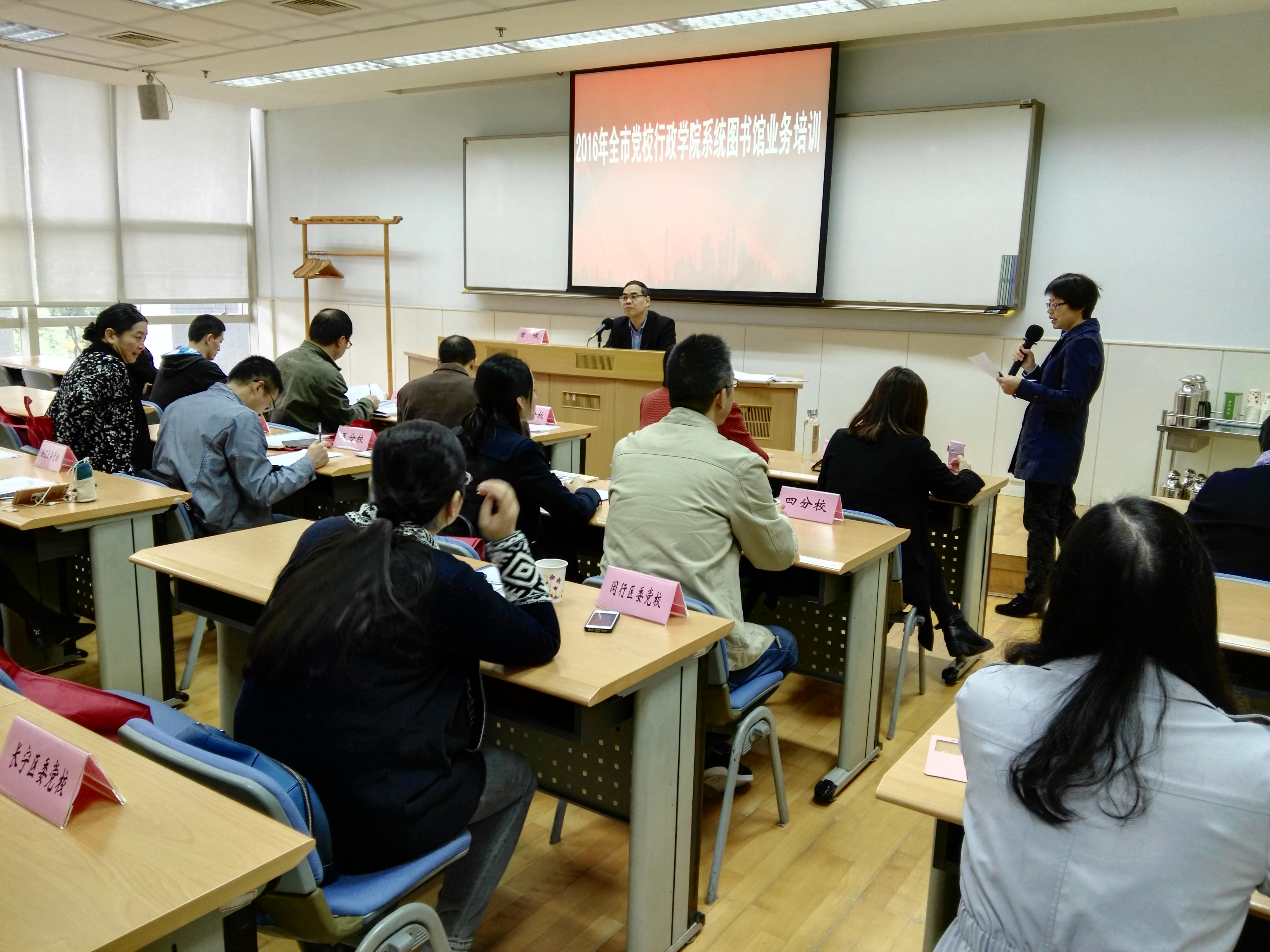 本网讯 11月15日,2016年图书馆学前沿讲座暨全市党校、行政学院系统图书馆业务培训在我校海兴教学楼205教室举行。副校院长曾峻出席培训活动并致辞,图书馆馆长唐月娥主持,全市党校、行政学院系统图书馆负责人和相关工作人员参加。培训另邀请华东师范大学信息管理系资深教授范并思作“图书馆阅读推广的理论与实践”学术讲座。
