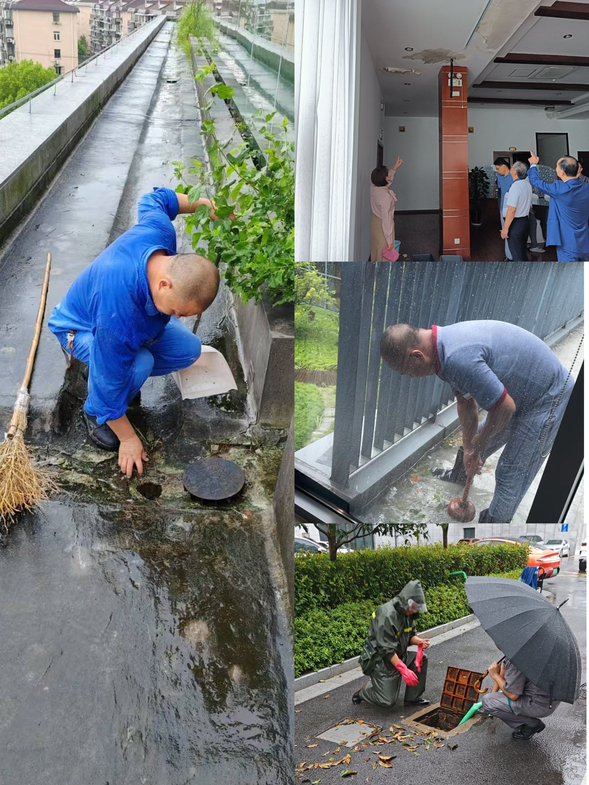 当“贝碧嘉”携狂风暴雨而来时,后勤保卫处和海兴大厦、上勤楼宇、宗保保安及徐汇园林等近百位同志放弃节假日,毅然投入到抗台一线。他们连续多日加班加点,坚守岗位,用实际行动诠释了责任与担当。9 月 16 日凌晨,“贝碧嘉”正式登陆上海,狂风呼啸,暴雨如注,整个校园瞬间陷入了一片风雨之中,尽管提前做了大量准备,但受超强台风影响,仍有近百棵树木受损,倾斜倒伏树木37棵;自动停车抬杆被吹断,非机动车顶棚被吹翻,部分玻璃及海泓食堂玻璃门爆裂,大礼堂、行政楼、教学楼、图书馆、文体中心等地多处漏水渗水。特别是行政楼6-12楼是台风涉水的重灾区,由于窗台渗水漏水,多个办公室都“水漫金山”,把窗台上的物品如文件、书籍都打湿了,个别办公室电源插座就在窗户边上,更是带来巨大的风险隐患。海兴大厦在房务部人手不足的情况下,快速调配工程部、餐饮部及内保部人员增援,用事先准备好的毛巾、废旧被单封堵渗漏水点,并反复检查更换毛巾被单,避免进一步渗漏水影响设备或地板。由于海华北侧部分雨棚钢索被台风吹断,厚重的雨棚油布被台风吹得来回摆动,影响到了雨棚的安全稳定,海兴大厦工程部同志冒着倾盆大雨,第一时间赶到现场进行抢修,他们不顾浑身湿透,加固雨棚并拆掉油布,避免雨棚倾倒造成更大的安全隐患。大礼堂舞台及部分座椅顶部渗漏严重,室外下大雨,室内下小雨,而9月20日即将有市级重要活动在大礼堂举行,为保障活动的正常举行,上勤楼宇的同志们想尽办法,封堵渗漏点,检查舞台电线,并与活动主办方及时沟通,制定安全合理的活动准备方案,在台风“普拉桑”带来的超大雨量中保障了活动圆满安全地举行。宗保保安各位同志顶着风雨反复在校园各地巡视检查,多次外出巡查的同志刚一出门,雨伞即被吹断,雨衣根本无法遮挡暴雨的侵袭,浑身上下没有一处干的地方,大家仍然冒雨检查,及时发现各种情况,并第一时间和后保处及其他服务保障部门沟通联络。徐汇园林的同志们冒雨处理倾斜倒伏的各类树木,保证倾倒的树木不对校园环境造成二次危害和影响校园道路的正常通行。在这场没有硝烟的战斗中,每个人都是不可或缺的守护者。