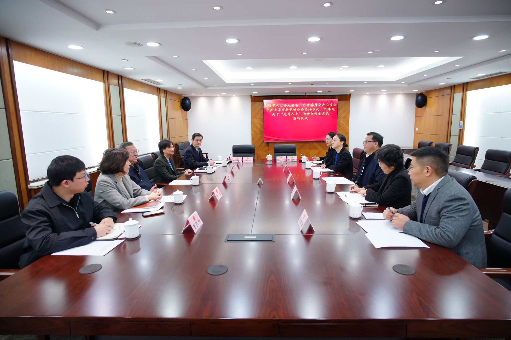 12月13日上午,上海市人大侨民宗委、外事委办公室与市委党校公务员培训处、外事处举行“走进人大”活动合作备忘录签约仪式。市人大外事委主任委员黄红、市委党校副校长王永杰见证合作备忘录签署。市人大外事委副主任委员费俭主持签约活动。市委党校公务员培训处和外事处负责人出席活动。