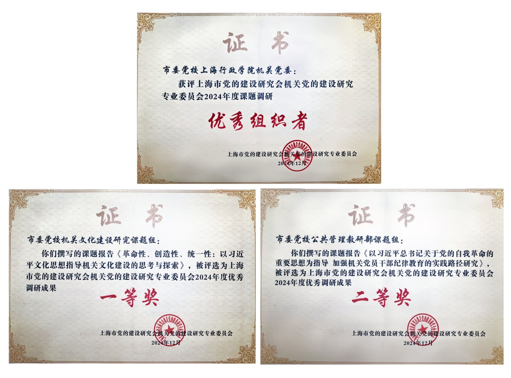近日,在上海市党的建设研究会机关党的建设研究专业委员会2024年度课题调研评选中,AG百家乐机关党委荣获“优秀组织者”,课题《革命性、创造性、统一性:以习近平文化思想指导机关文化建设的思考与探索》(许晓春、苏晨雪)荣获“优秀调研成果一等奖”,课题《以习近平总书记关于党的自我革命的重要思想为指导 加强机关党员干部纪律教育的实践路径研究》(徐瑜璐、董幼鸿)荣获“优秀调研成果二等奖”。