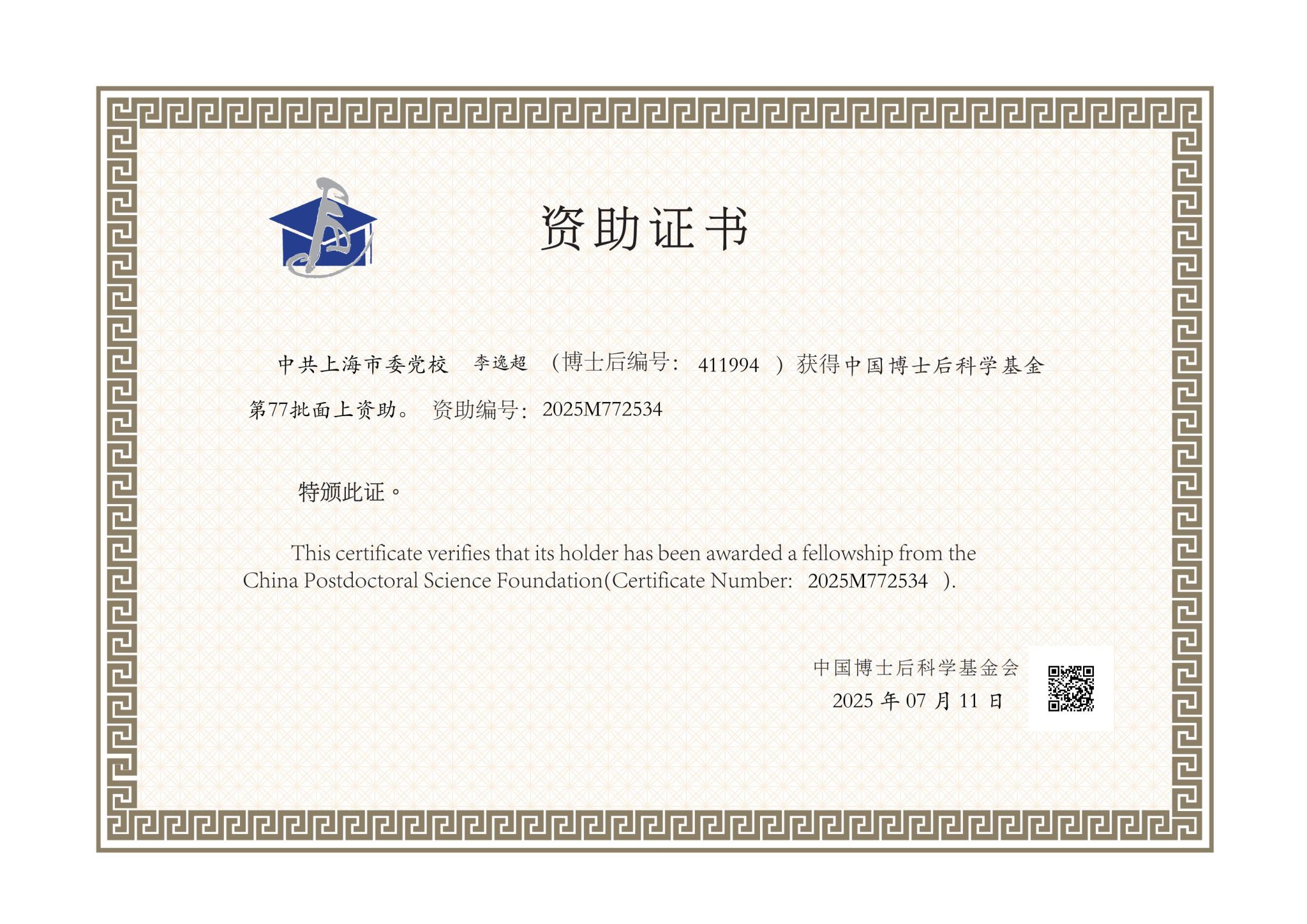 根据《中国博士后科学基金资助规定》和《中国博士后科学基金资助指南(2025年度)》,经专家评审,7月11日,中国博士后科学基金会公布了第77批面上资助获资助人员名单。我校博士后李阳、李逸超入选,资助金额分别为5万元。