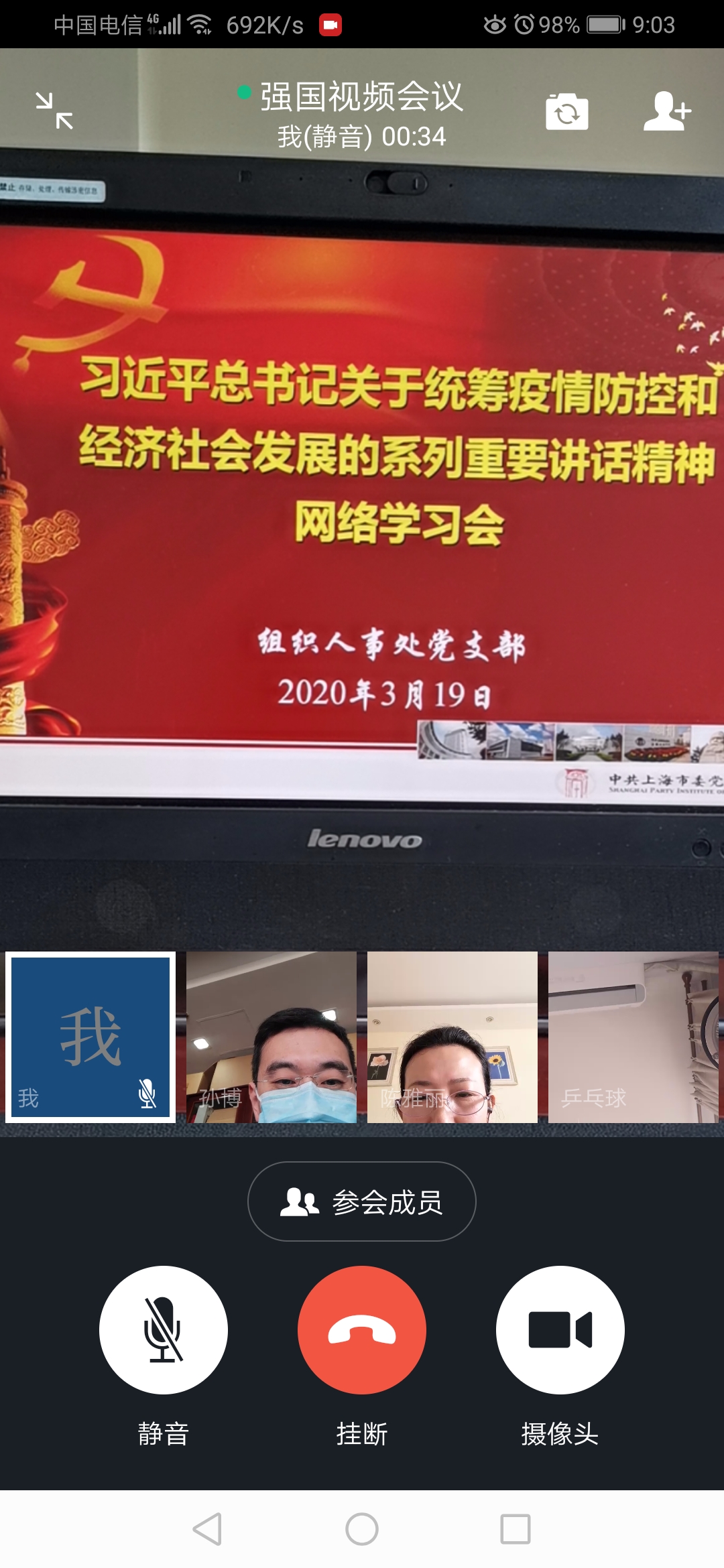 本网讯 3月19日上午,组织人事处党支部在“学习强国”平台上召开视频会议,组织党员集中学习习近平总书记关于统筹疫情防控和经济社会发展的系列重要讲话特别是在武汉考察新冠肺炎疫情防控工作时的讲话精神。