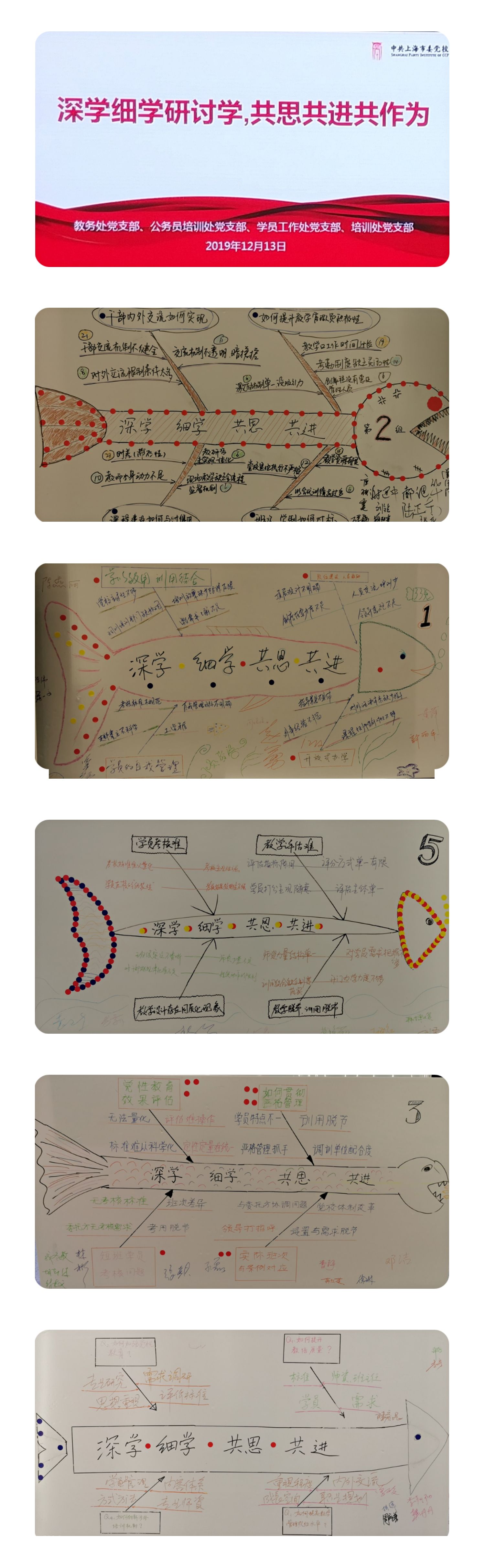 创新支部活动开展方法。此次联合支部活动采取了结构化研讨的方法聚焦《条例》学习,旨在学深学实学透。四个支部50余名党员以抽签的形式随机分成5个研讨小组,结合各自工作实际,对照新老《条例》,在催化师的催化引导下进行头脑风暴,大家一起聚焦新要求、查找新问题,每个小组在第一轮研讨后找到了落实贯彻《条例》存在的问题,问题主要聚焦在学员考核难、教学评估难、教学管理队伍建设难、提高教学设计针对性难、增强党性教育实效性难、涉外培训机制完善难等方面。每个小组又通过四轮快速研讨,进一步分析问题、探究原因,现场氛围活跃、讨论热烈。最后在大家群策群力贡献智慧的基础上,全体党员一起动手绘制了五幅鱼骨图,将此次结构化研讨的成果形象直观的呈现出来。