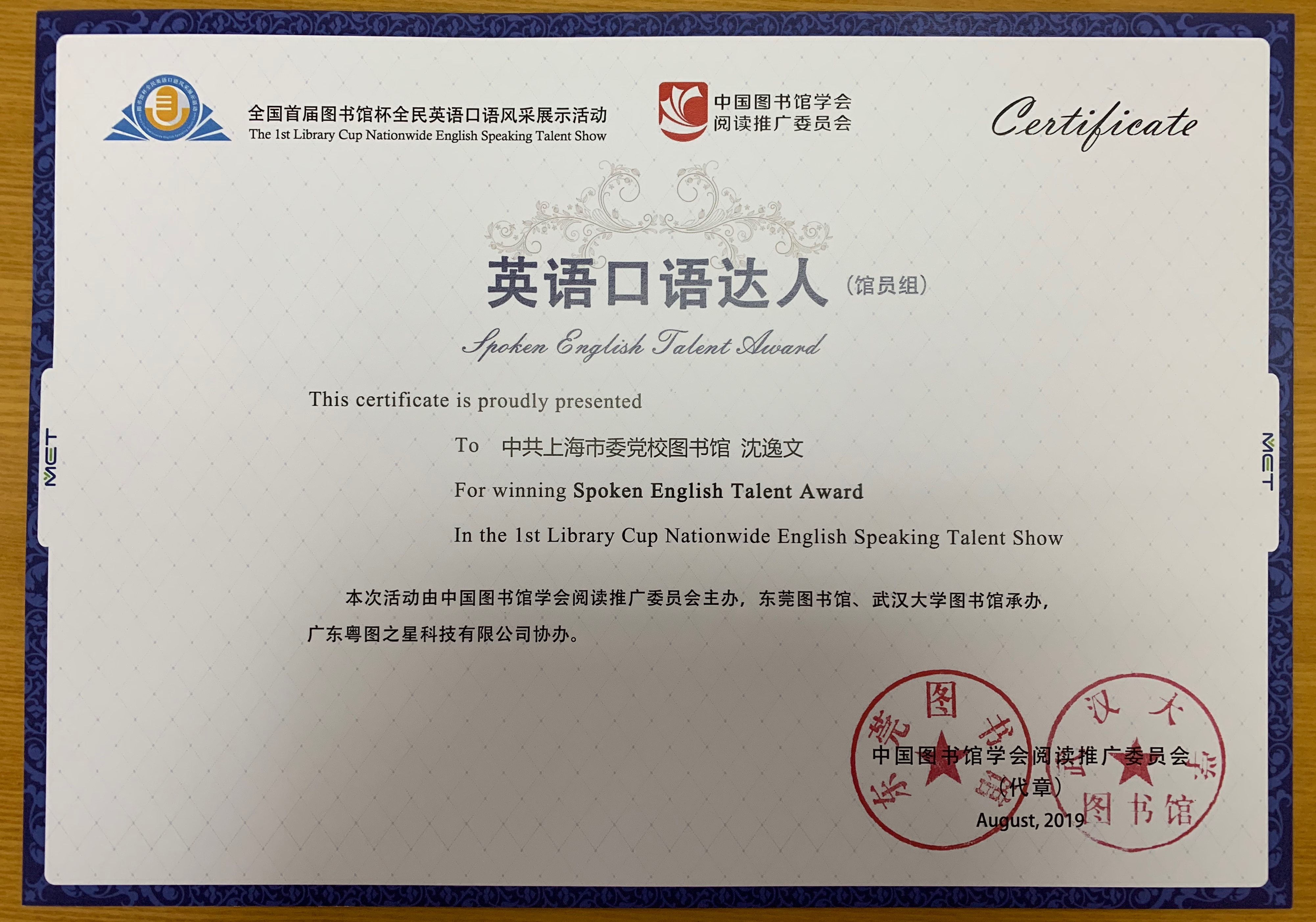 本网讯 由中国图书馆学会阅读推广委员会主办,东莞图书馆、武汉大学图书馆承办的全国首届“图书馆杯”全民英语口语风采展示活动于近日落下帷幕。我校图书馆馆员沈逸文荣获馆员组“英语口语达人”称号。 本次活动从今年4月1日正式启动,全国共 1317个图书馆参与,171778 名选手报名参加。校图书馆积极组织读者及馆员报名参加,活动旨在倡导全民阅读,不断创新阅读推广方式,充分体现出图书馆学习中心的服务特质;同时,增强图书馆工作人员和读者专业英语沟通技能,提升党校人涉外服务能力。