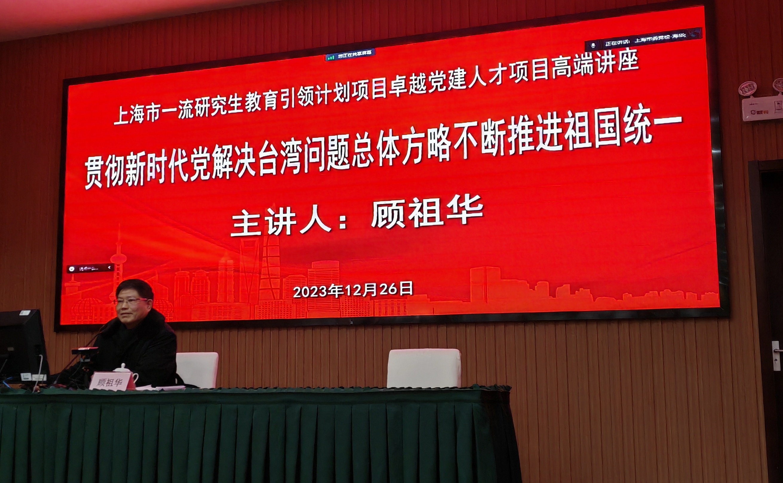本网讯 为深入学习贯彻党的二十大精神,弘扬总体国家安全观,巩固深化主题教育成果,引导师生坚决维护两岸关系和平发展和祖国统一,12月26日下午,研究生部在虹漕南路123号三号楼一楼报告厅举办上海市一流研究生教育引领计划项目——卓越党建人才项目高端讲座。上海市人民政府台湾事务办公室原研究室主任、上海海峡两岸研究会驻会副会长顾祖华受邀作“贯彻新时代党解决台湾问题总体方略,不断推进祖国统一”专题讲座。