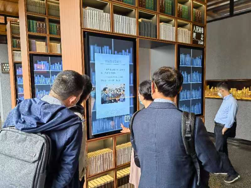 进入展示馆,首先映入眼帘的是关于人民城市理念的展陈,通过电子书、视频、图片、数据等多类型的丰富资料向支部党员呈现了人民城市理念的发展概述、理论渊源、丰富内涵、时代价值、上海实践等,尤其是在“人人都有人生出彩机会、人人都能有序参与治理、人人都能享有品质生活、人人都能切实感受温度、人人都能拥有归属认同”的展板前,支部党员展开了热烈讨论,认为其高度凝练了人民城市理念的核心。