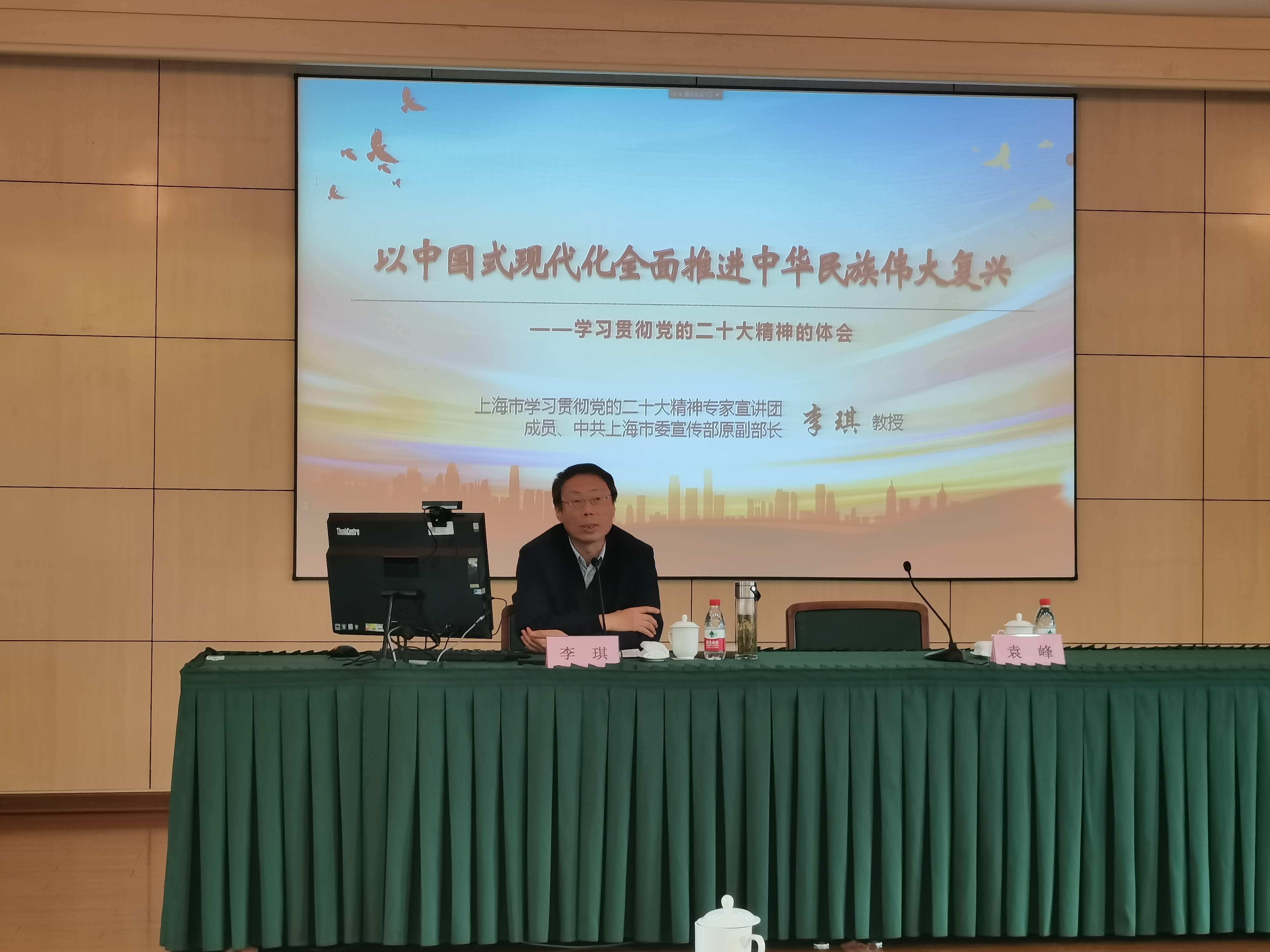 本网讯 4月18日,研究生部邀请中共上海市委宣传部原副部长、上海市党的二十大精神专家宣讲团成员李琪教授开展题为“以中国式现代化全面推进中华民族伟大复兴”讲座。研究生部主任袁峰主持讲座,研究生部全体党员和全体在校学术型研究生参加讲座。