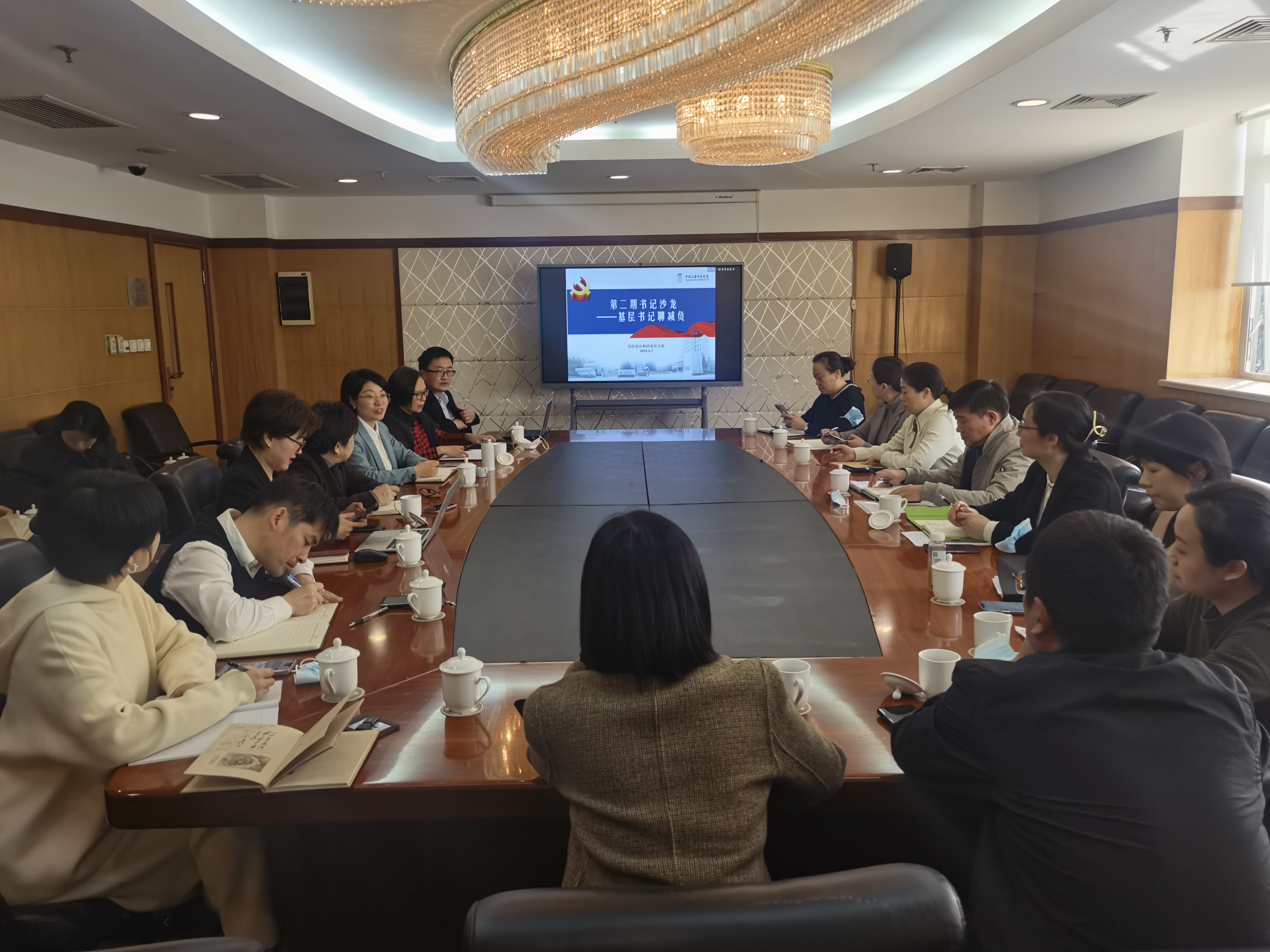 本网讯 3月7日,党的建设教研部党支部开展以“书记聊‘减负’”为主题的第二场“书记沙龙”活动。活动邀请10余名来自街镇居村的基层书记和来自市、区委办局以及街道的相关领导和党员们一起交流座谈。沙龙由吴海红教授主持,党的建设教研部党支部全体党员、中共党史(含党的建设)部分研究生参加沙龙活动。