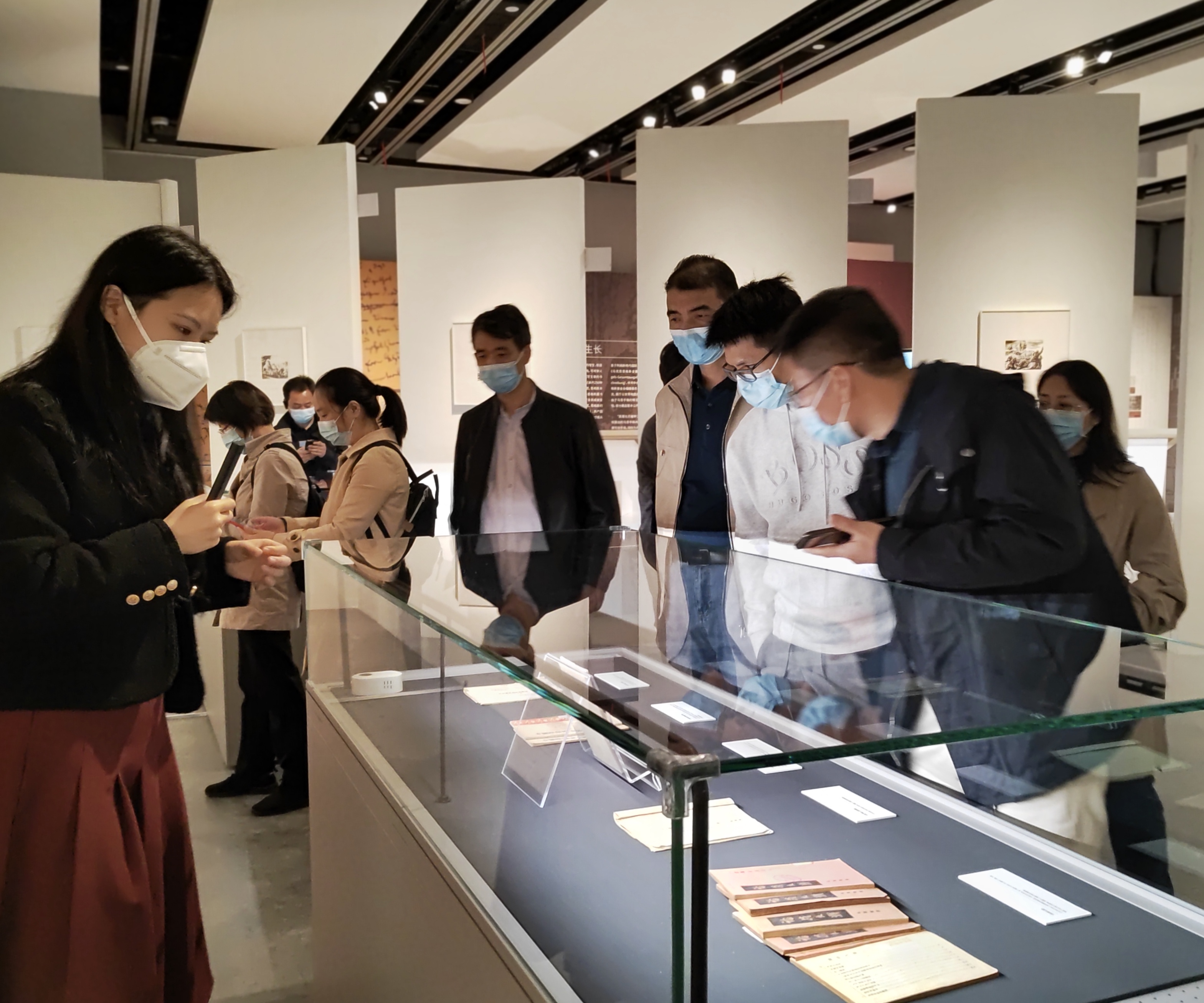 馆员们首先参观了“真理光芒耀申江——马克思恩格斯手稿与上海红色风华展”,该展展示了12份来自阿姆斯特丹国际社会史研究所馆藏的马克思与恩格斯以及共产国际代表马林的珍贵手稿,包括《经济哲学手稿》《关于费尔巴哈的提纲》《共产党宣言》《反杜林论》等对科学社会主义理论形成发展、对于中国共产党成立和早期发展具有重要研究价值的手稿,结合上海图书馆馆藏近现代文献、老照片、唱片、版画、招贴画等特色馆藏资源,重现马克思主义学说与思想体系的孕育和诞生,以及具有中国特色的科学社会主义理论体系生根发芽的过程。