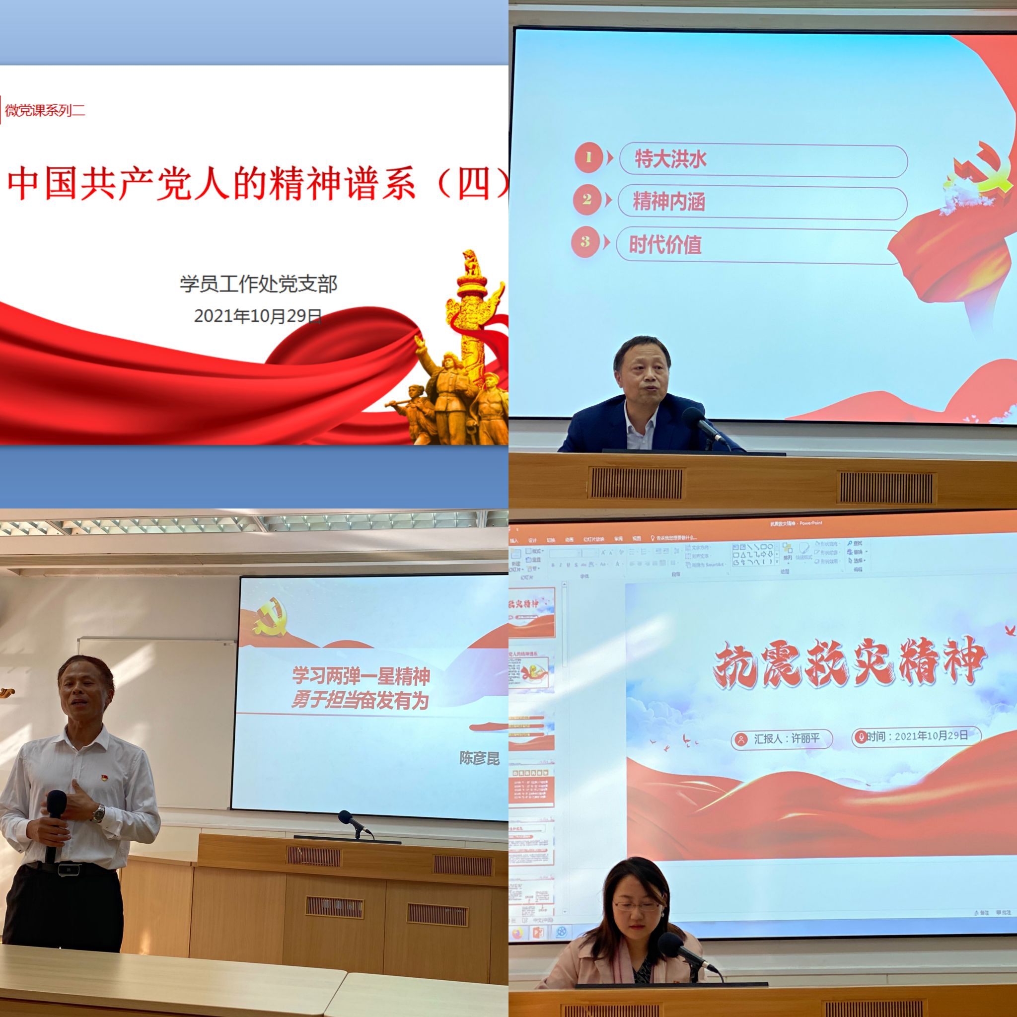 此次微党课由周新普、陈彦昆和许丽平等3名党员主讲。3位党员提前搜集资料,精心准备课件,为支部党员带来了动听动情动心的微党课。周新普通过梳理我国长江洪灾的历史以及引发洪灾的原因,将大家带到1998年军民齐心协力抗洪现场,再次感受到“万众一心、众志成城,不怕困难、顽强拼搏,坚韧不拔、敢于胜利”的伟大抗洪精神。陈彦昆通过大量的图片让大家了解了我国大力发展“两弹一星”的历史背景和为此做出伟大历史功绩的功勋人物,以及由此产生的“热爱祖国、无私奉献,自力更生、艰苦奋斗,大力协同、勇于登攀”的“‘两弹一星’精神”。许丽平通过梳理2008年汶川地震大事记,让大家了解了在抗震救灾重建的豪迈进程中,中华民族和中国人民用理想、用信念、用真情展示出来的“万众一心,众志成诚,不畏艰险,百折不挠,以人为本,尊重科学”的伟大抗震救灾精神。