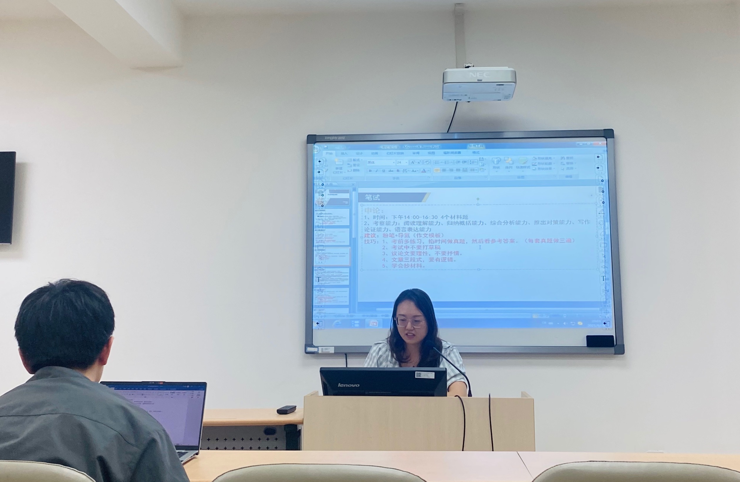本次交流会分为考博、考公和国企工作经验分享三个板块进行。在考博版块,邀请到了今年成功考入上海财经大学的黄超同学分享考博经验。黄超结合自己的备考经历,向同学们分享了申请考核制的基本流程、备考及应试等经验。在报考公务员方面,成功考入市直单位的崔岩珠同学向同学们详细介绍了国考、省考中笔试和面试的经验与技巧,成功考上选调生的史金玲同学向大家分享了选调生的备考经验;成功入职上海国企的郑水静同学和马帅同学和大家交流了实习与择业时的心得体会,在如何做好就业准备等方面提出了中肯的建议。