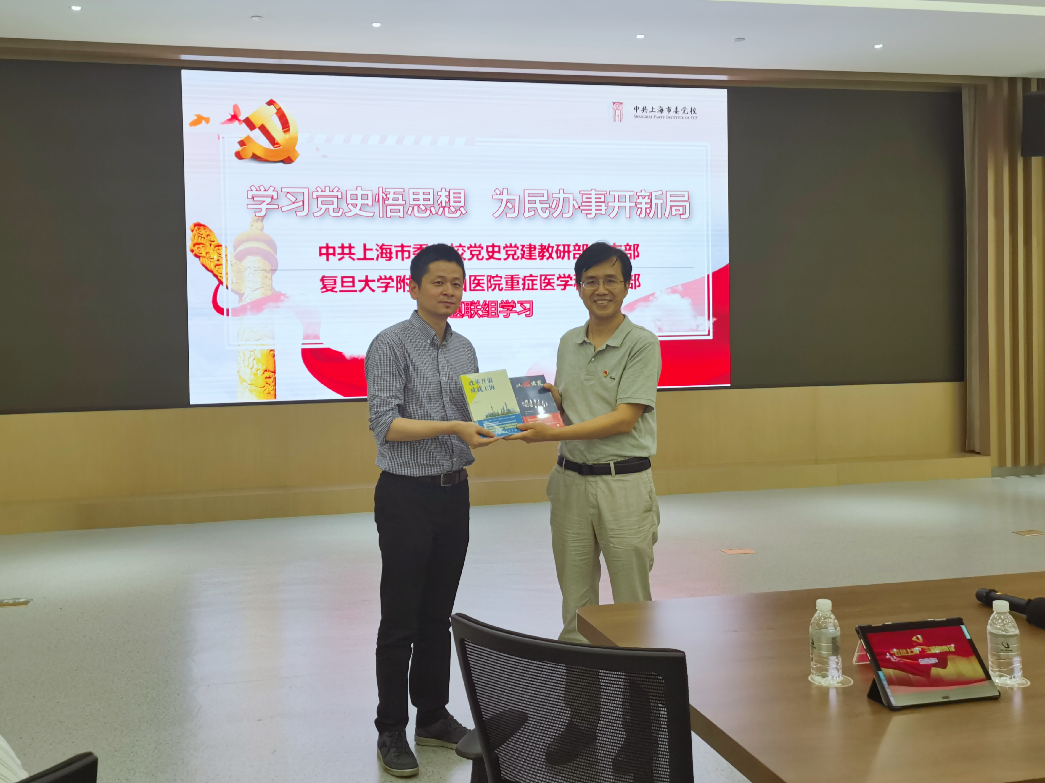 复旦大学附属中山医院重症医学科党支部党员们首先来到学校宣誓墙,在支部书记钟鸣的带领下重温了入党誓词。随后,一行人来到红色上海主题教育馆,党史党建教研部党支部书记吴志洁向各位介绍了支部特色并分享了支部近期开展学习党史活动的经验。教研部主任赵刚印代表支部党员向以钟鸣书记为首的"最美逆行者们"致以崇高的敬意和衷心的感谢,并赠予《改革开放成就上海》《从心出发》两本支部党员参与编写的书籍。党史党建党支部副书记赵大朋为大家讲授了《红色起点,精神家园——中国共产党与上海》党史专题课。