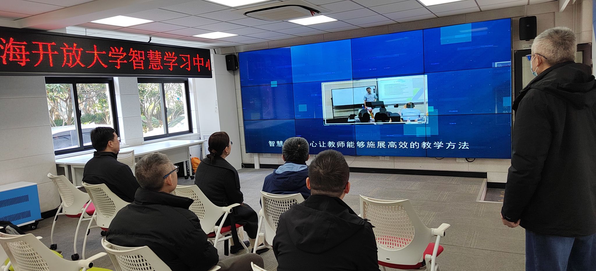 调研组一行随后前往上海开放大学,调研学习智慧教室建设情况。上海开放大学相关负责人介绍了办学概况和智慧教室建设历程。该校通过数字孪生平台,现已实现教室环境、教学行为和设备状态的实时监控与数据分析。双方围绕数字孪生技术、线上线下融合教学、AI赋能教育等议题,展开深入讨论。