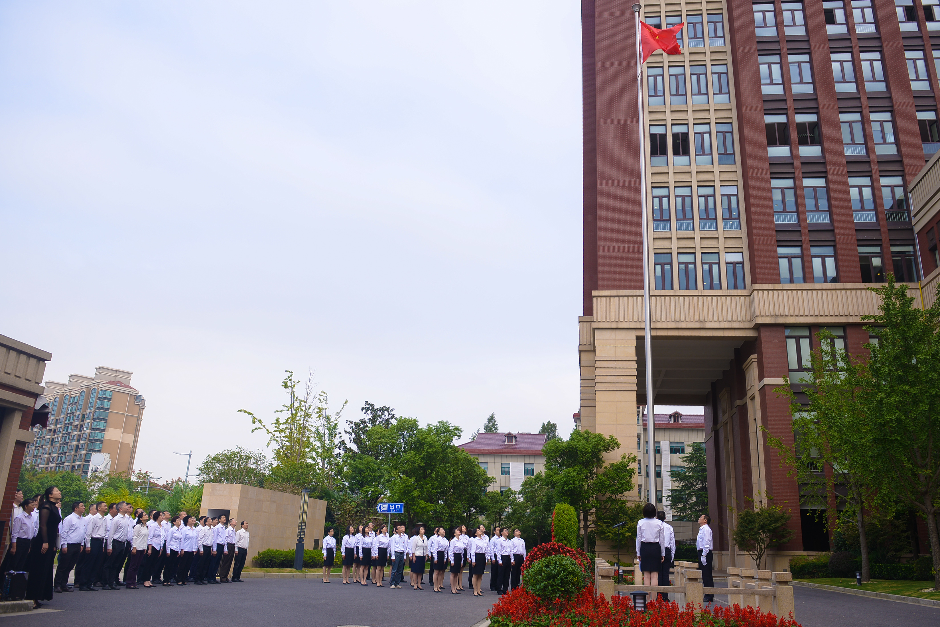 上午8时30分,升国旗仪式正式开始。徐峰、胡如兵、徐涛三位学员迈着整齐的步伐,护旗入场。全场高唱《义勇军进行曲》,目送五星红旗冉冉升起。在迎风猎猎的国旗下,学员代表陈越围绕学习领会习近平总书记在新中国成立70周年大会上的重要讲话精神作了交流发言,他表示:“习近平总书记重要讲话的关键词在于‘前进’二字,我们要深刻领会、全面践行,做到不忘初心、继续前进,坚定决心、执着前进,维护核心、追随前进,充满信心、阔步前进。”