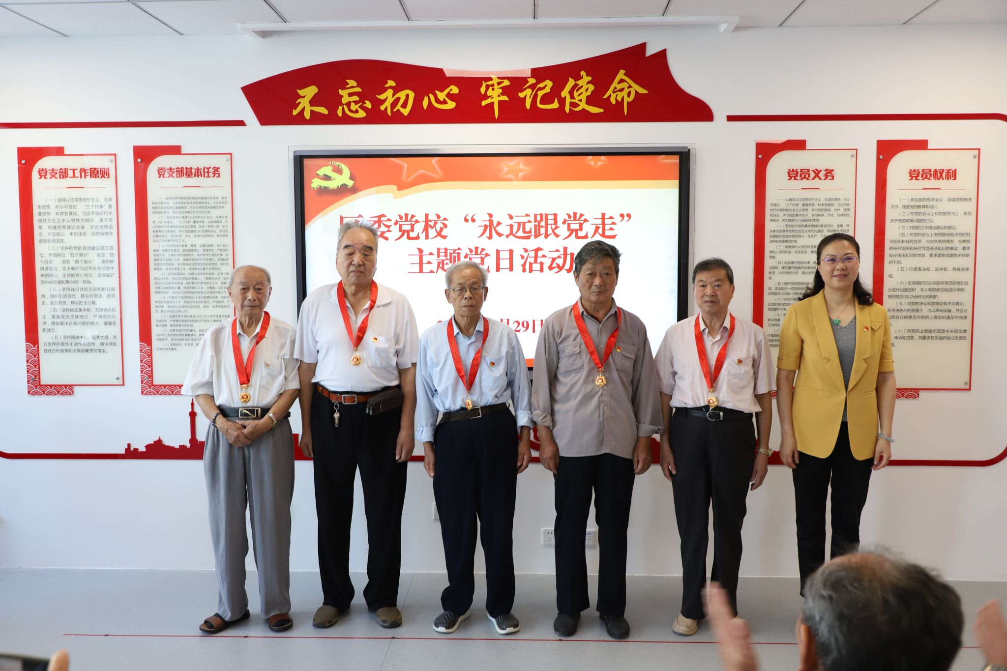 组织开展“永远跟党走”主题党日活动,常务副校长宋佩娟为党龄满50周年的老党员颁发“光荣在党50年”纪念章。一枚纪念章,是荣誉,是肯定,是致敬,也是感恩。老党员们表达了对获得“光荣在党50年”纪念章的喜悦之情,表示将牢记初心使命,永葆革命青春,做一个永不褪色的共产党员。